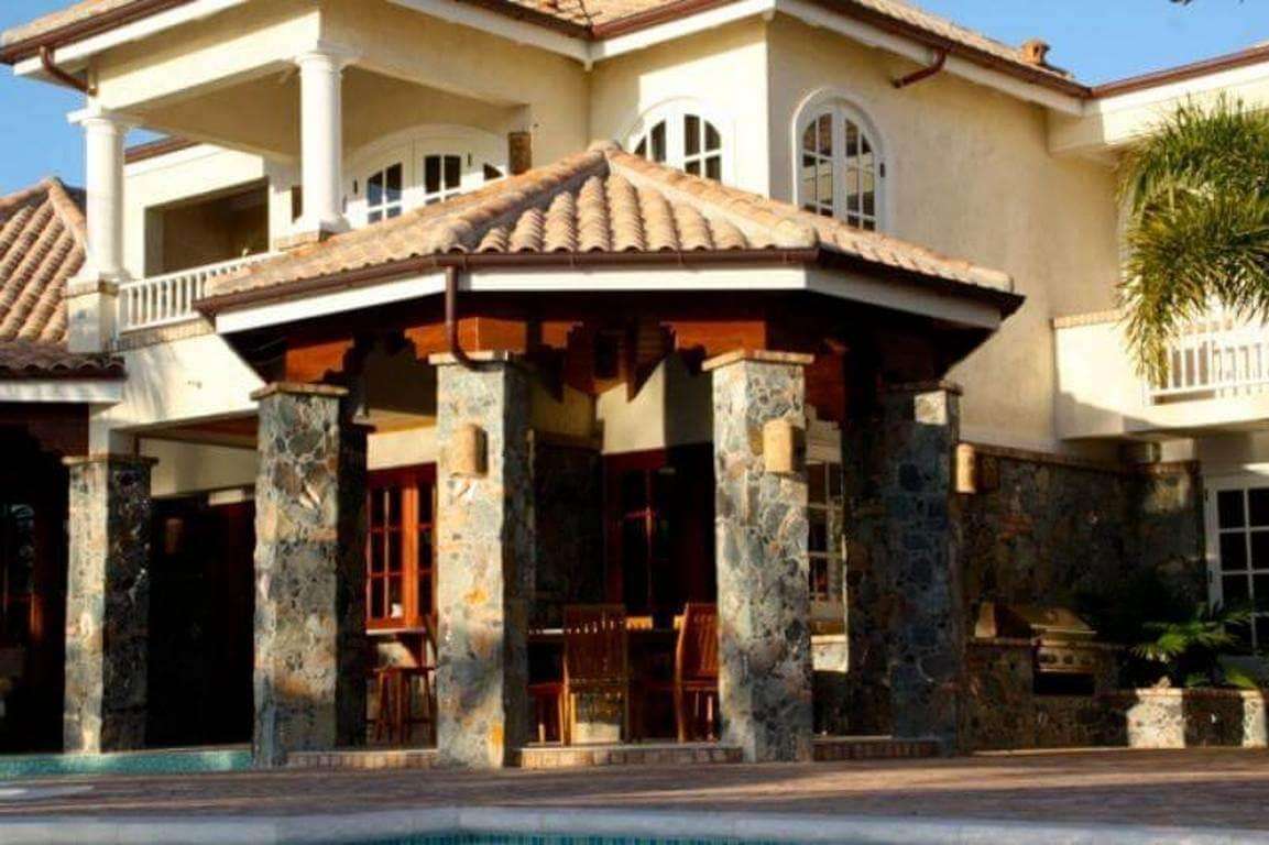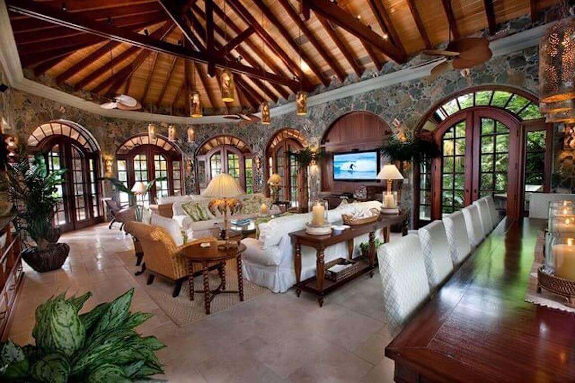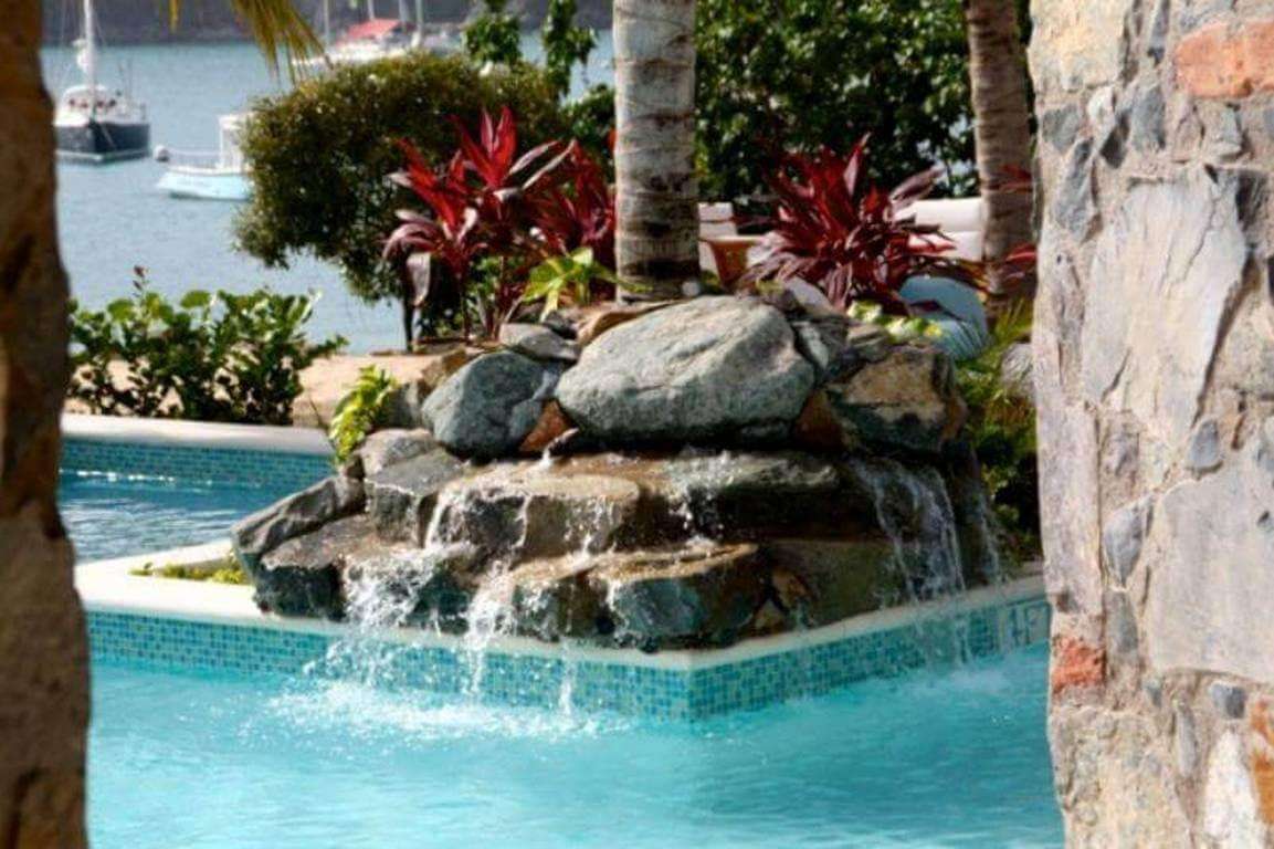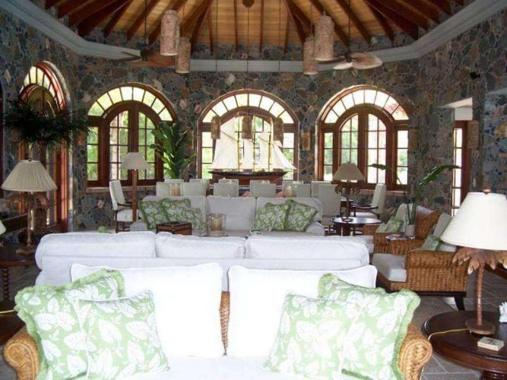 Situated on over one acre of waterfront land behind an electronic gate landscaped with tropical flowers and graceful royal, foxtail and coconut palm trees, spectacular A La Mer's large-scale design and execution is an artful combination of both colonial West Indies and classic St. John, incorporating French antique terra cotta roof tiles, St. John shell- and stonework, aged brick, all melded to create stunning exteriors, and inside, a pleasing floor plan which flows easily and provides lots of space for everyone's comfort.