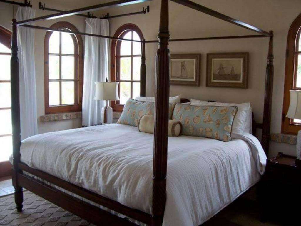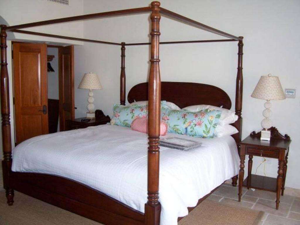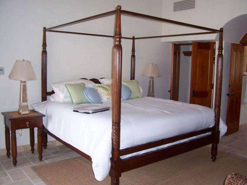 One of these five upstairs suites is A La Mer's primary suite, a larger suite with a king four-poster bed, a private roofed patio with seating, and a spacious bath. The sumptuous primary bath features a double vanity, a separate WC with a bidet, and a semi-alfresco double shower clad in glass tile and travertine. The other four suites have romantic four-poster king beds and ensuite baths (the corner suite has a tiled semi-alfresco shower).