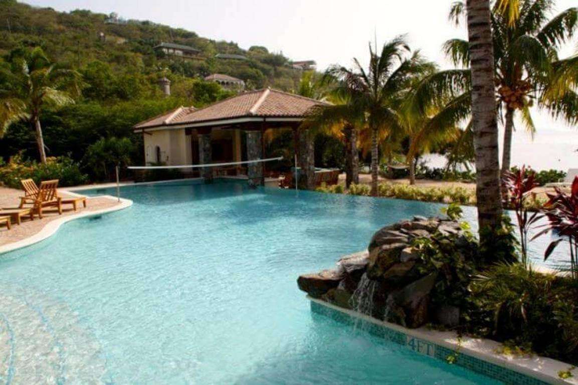 The pool is absolutely spectacular! It has a four-inch deep shallow shelf, perfect for sun loungers and for small children, a waterfall, and is bordered on the ocean side with a "beach," a strip of white sand set with more chaise lounges and a stone fire pit. The pool also features a swim-up bar with underwater bar stools at the pool cabana, a wonderful poolside entertainment pavilion with large-screen cable TV and DVD player, plus a wet bar with icemaker, beverage cooler and dishwasher.