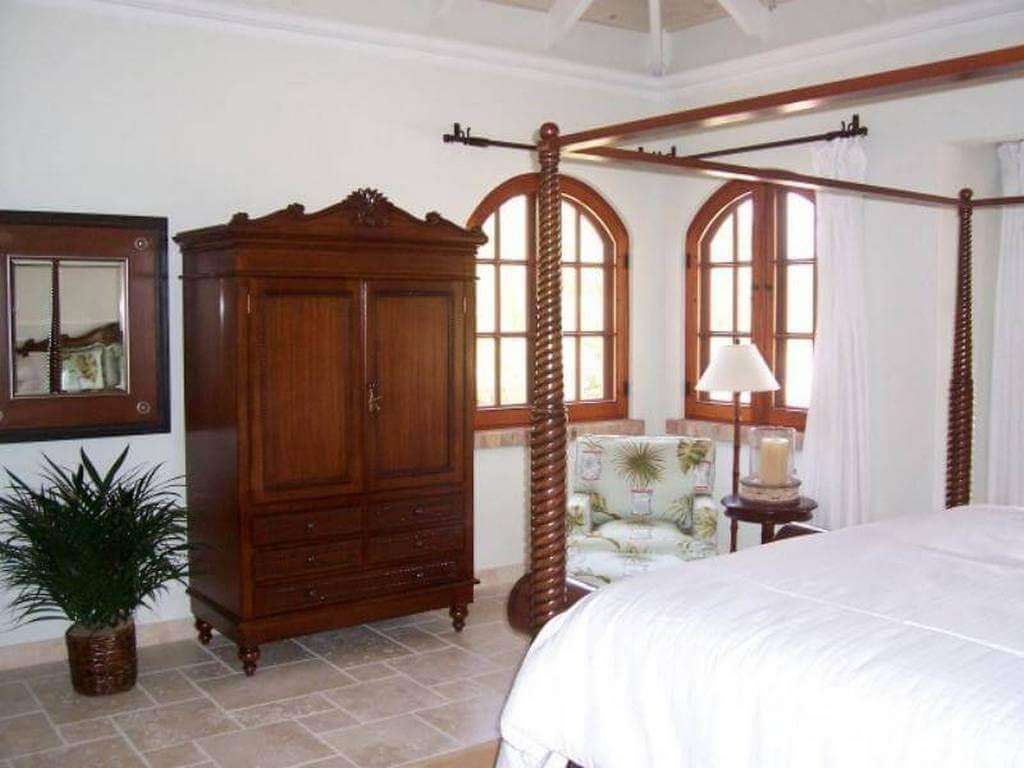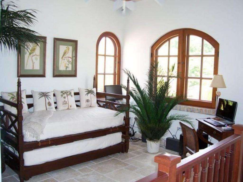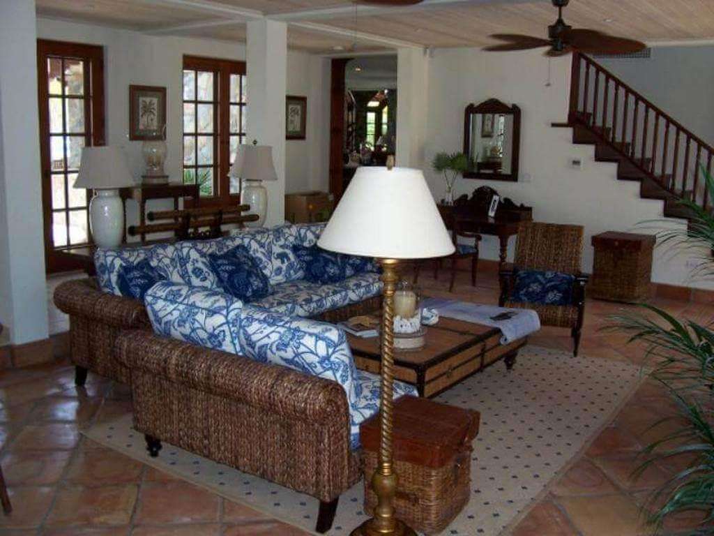 Twin mahogany staircases ascend from either side of the family room to A La Mer's upper floor, where five more air-conditioned bedrooms/suites overlook the pool and majestic yachts riding at anchor on sparkling Great Cruz Bay. These suites all enjoy central air-conditioning, large ensuite baths tiled in charming designs, and via screened french doors, each has its own balcony.