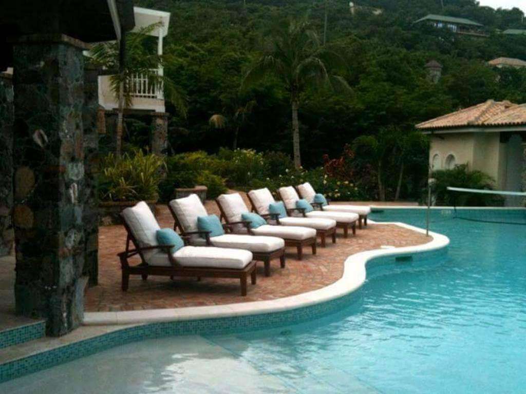 Outside the Main Villa on the Great Cruz Bay side is A La Mer's shaded poolside terrace, furnished with plush upholstered seating for watching the kids in the pool, reading or napping, and a large round table under a roofed pergola for alfresco meals. The pass-through from the kitchen is incorporated into an adjoining counter lined with bar stools. This expansive outdoor living area, where you'll spend most of your time, also has two gas grills, one of them built into a charming garden patio, a ping-pong table for family championship competitions, and a deck lined with cushioned chaise lounges for sun worshippers.