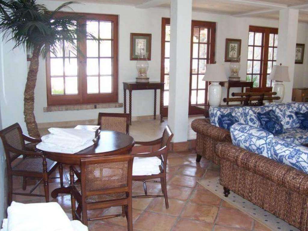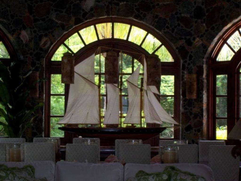 White slipcovered sink-into sofas and chairs are grouped around the Great Room to accommodate a large party, and a mahogany dining table for 14 is flanked by a stunning model yacht in full sail.