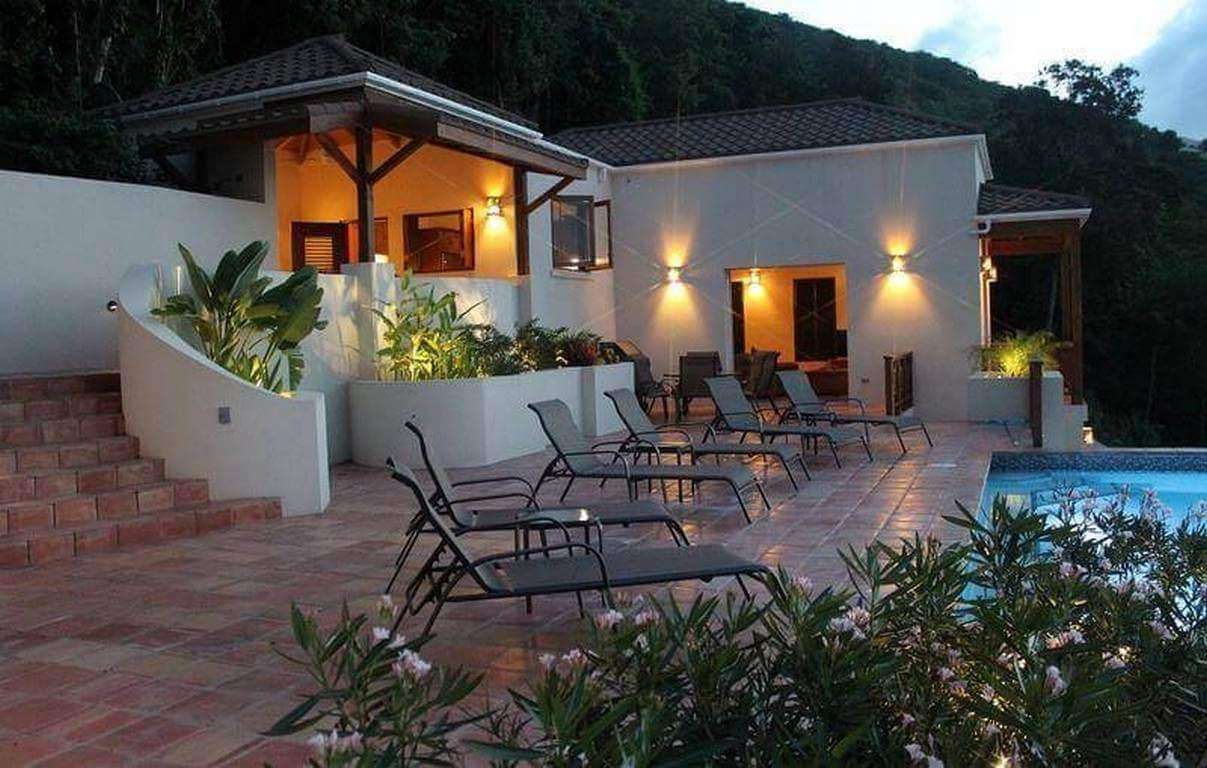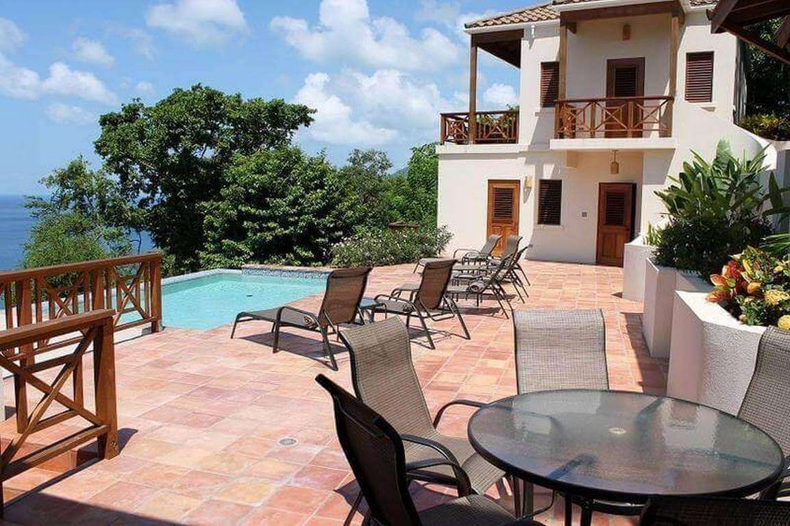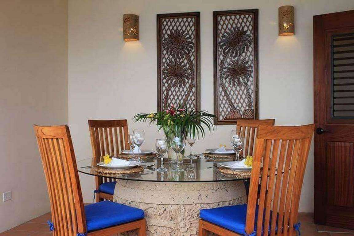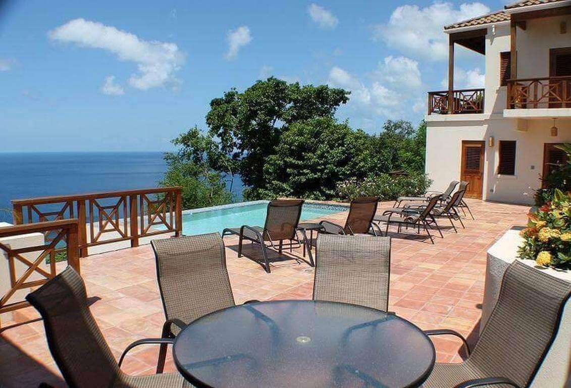 Entering through the welcoming portico brings you into Alfresco's mezzanine. which overlooks the villa's high-ceilinged Great Room below. The mezzanine connects to the Great Room via a graceful curving staircase and also leads into the completely-equipped kitchen with granite countertops and stainless steel appliances; the kitchen looks out to the sea view. Adjacent to the kitchen is a covered pavilion with a glass-and-stone table for outside dining. From this cool, open-air pavilion, a walkway leads to a classic West Indian welcoming-arms staircase which descends between planters filled with palms, colorful bird of paradise, ixora, ginger and bougainvillea, to the tiled sun terrace and solar-heated pool.