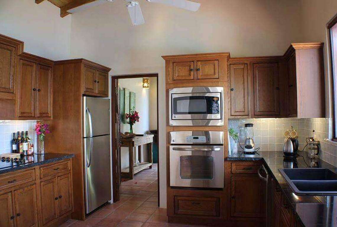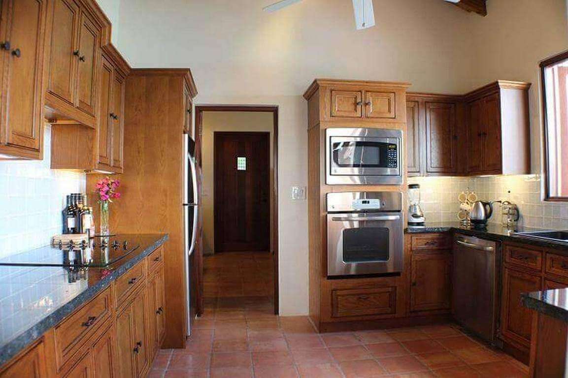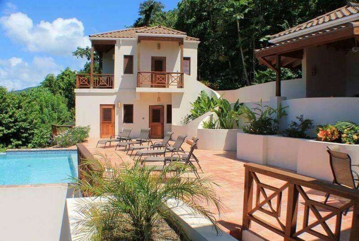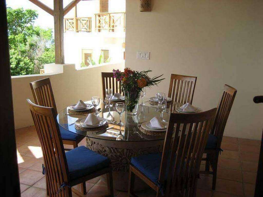 Entering through the welcoming portico brings you into Alfresco's mezzanine. which overlooks the villa's high-ceilinged Great Room below. The mezzanine connects to the Great Room via a graceful curving staircase and also leads into the completely-equipped kitchen with granite countertops and stainless steel appliances; the kitchen looks out to the sea view. Adjacent to the kitchen is a covered pavilion with a glass-and-stone table for outside dining. From this cool, open-air pavilion, a walkway leads to a classic West Indian welcoming-arms staircase which descends between planters filled with palms, colorful bird of paradise, ixora, ginger and bougainvillea, to the tiled sun terrace and solar-heated pool.