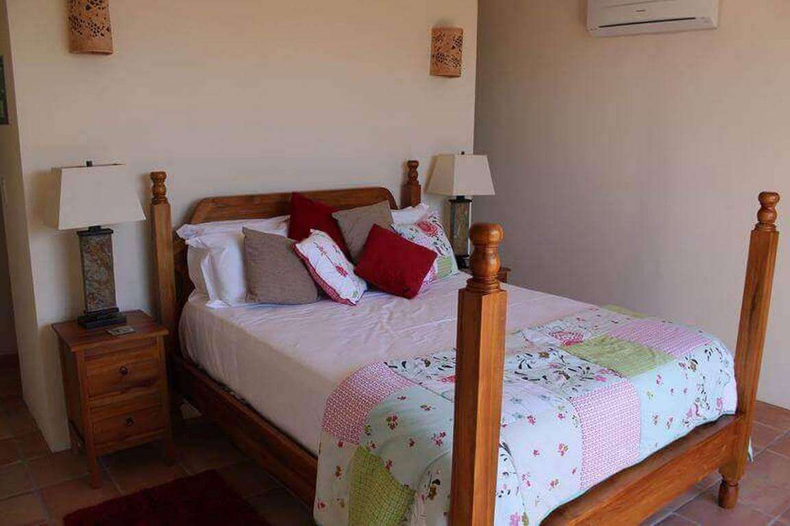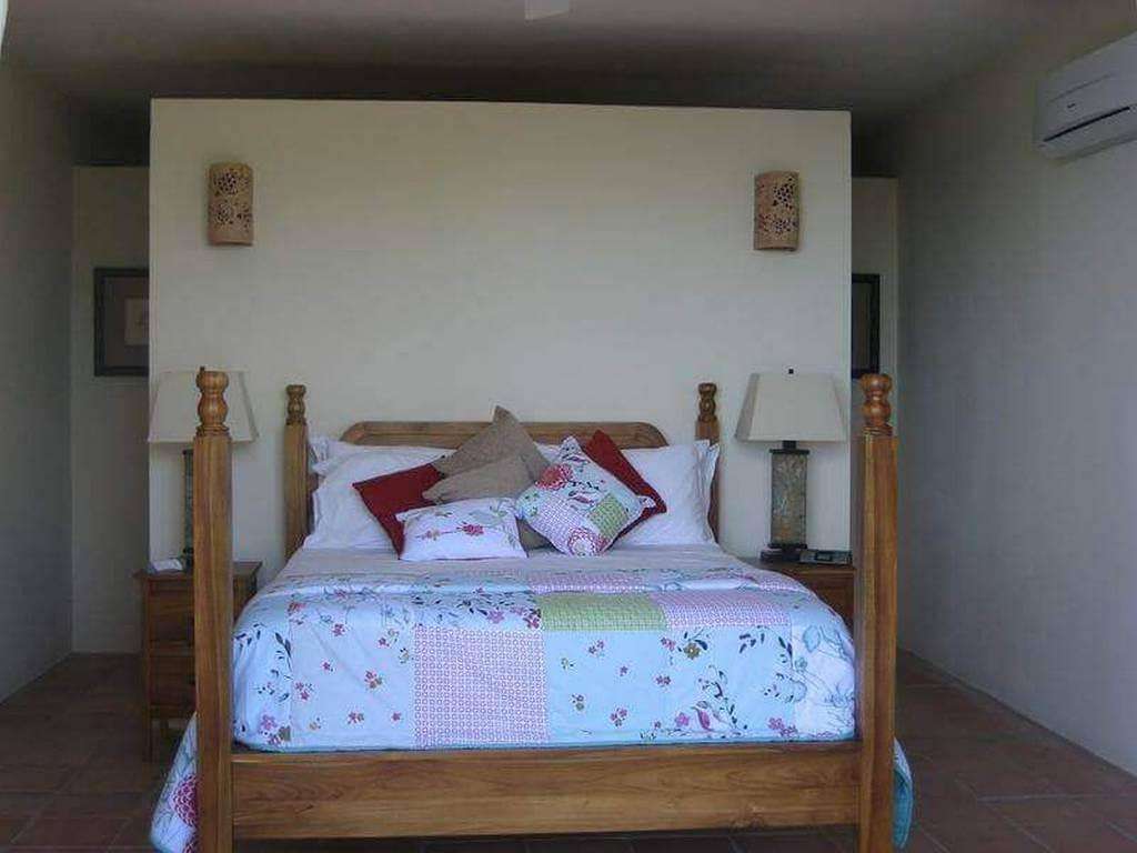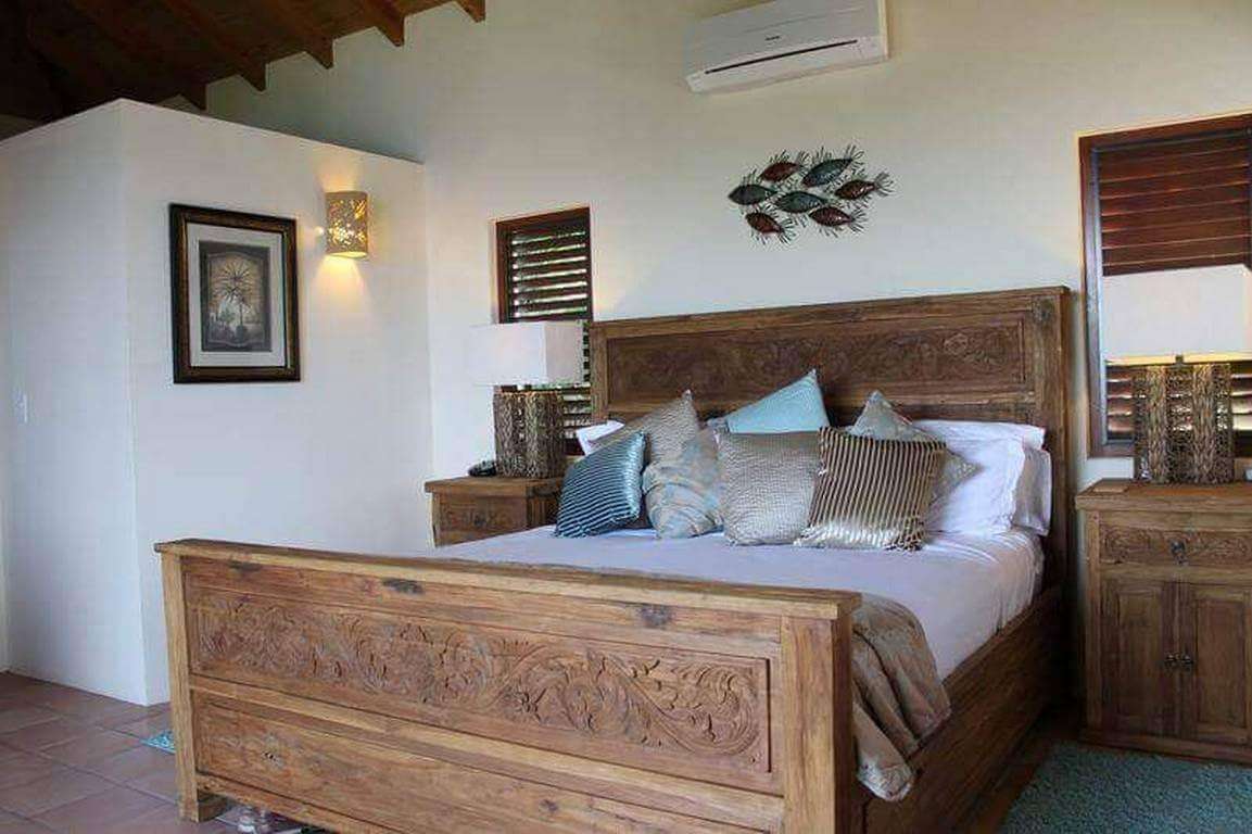 Alfresco's third air-conditioned bedroom/bath, situated directly below the living room in the other pavilion across the terrace, is accessed by a staircase off the pool deck. It has a queen four-poster bed, and also features slider pocket doors which open out to the garden fronting the villa. This suite is very private.