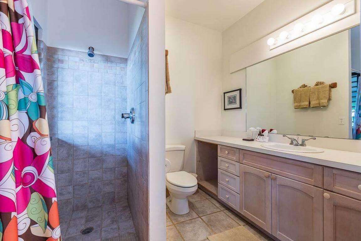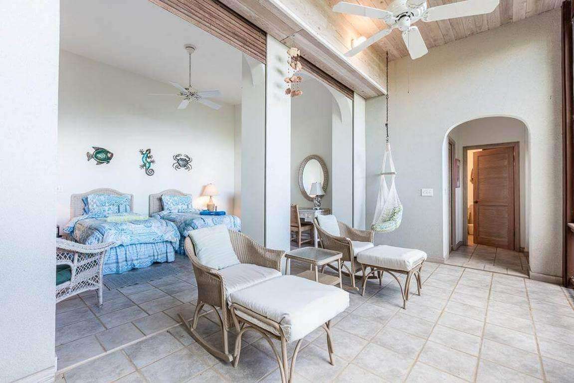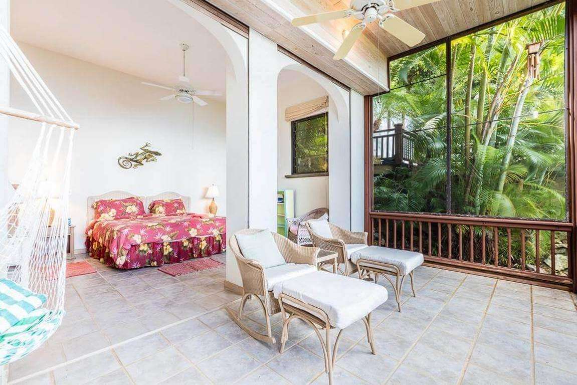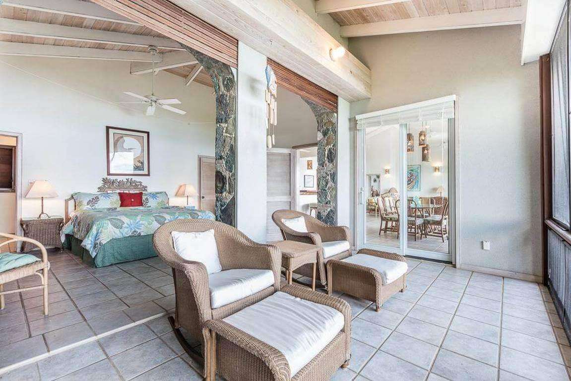The four oversize bedrooms (305 sq/ft) are all located to insure excellent privacy from each other. The upper level east (right) bedroom has a king bed while the other three bedrooms have twin beds that convert to kings. The two lower level bedrooms are accessed by exterior stairs from the upper deck or the pool deck. Each bedroom has a lovely 150 sq ft fully screened porch with wicker furniture, and each bedroom has a telephone and a tiled bath and shower.