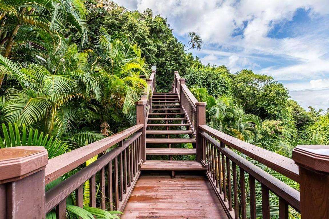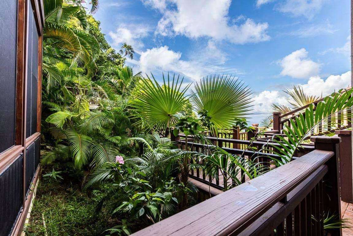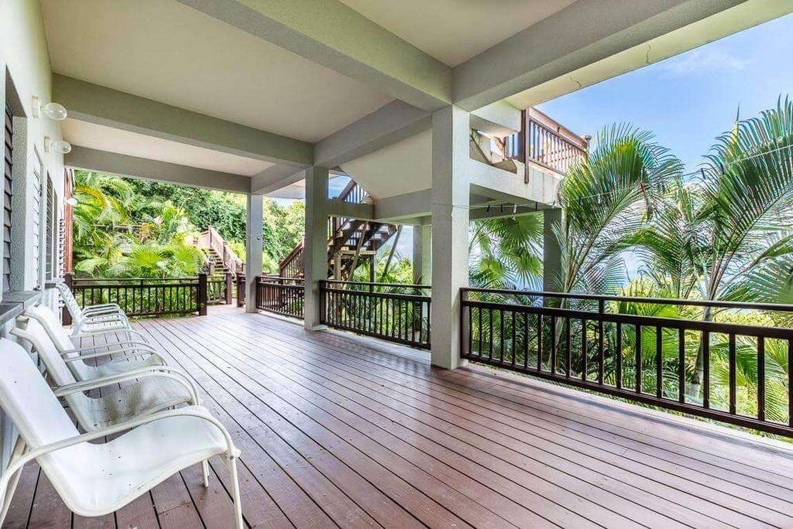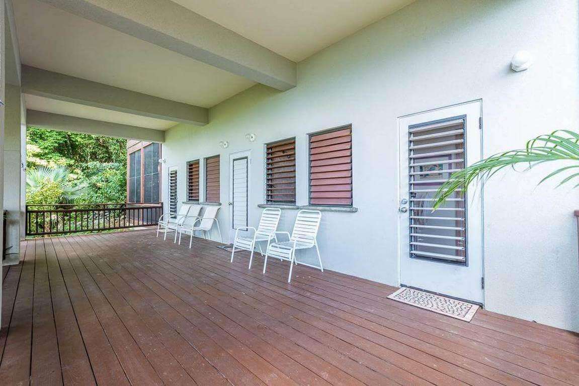 The four oversize bedrooms (305 sq/ft) are all located to insure excellent privacy from each other. The upper level east (right) bedroom has a king bed while the other three bedrooms have twin beds that convert to kings. The two lower level bedrooms are accessed by exterior stairs from the upper deck or the pool deck. Each bedroom has a lovely 150 sq ft fully screened porch with wicker furniture, and each bedroom has a telephone and a tiled bath and shower.