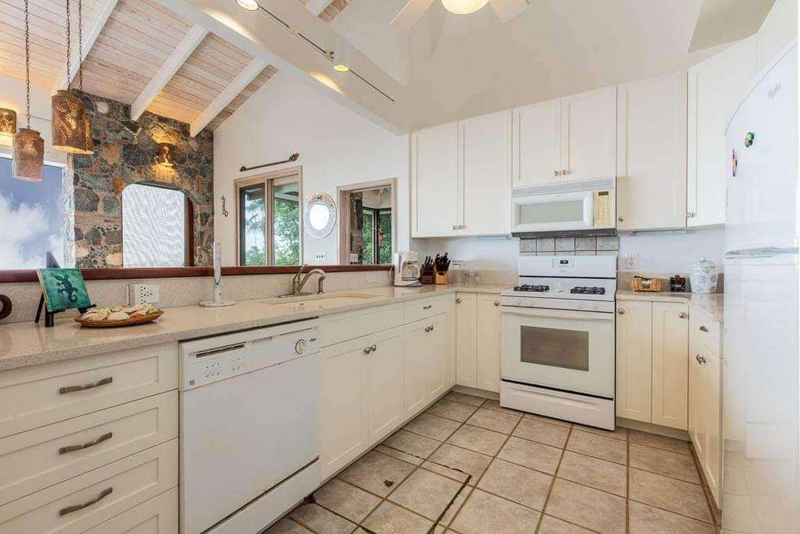 The kitchen is in the rear of the great room but it also shares the gorgeous view. The kitchen is fully equipped, including a refrigerator, gas range, dishwasher and microwave oven. In the back of the kitchen there is a pantry and a washer/dryer and a gas grill is on the upper deck.
