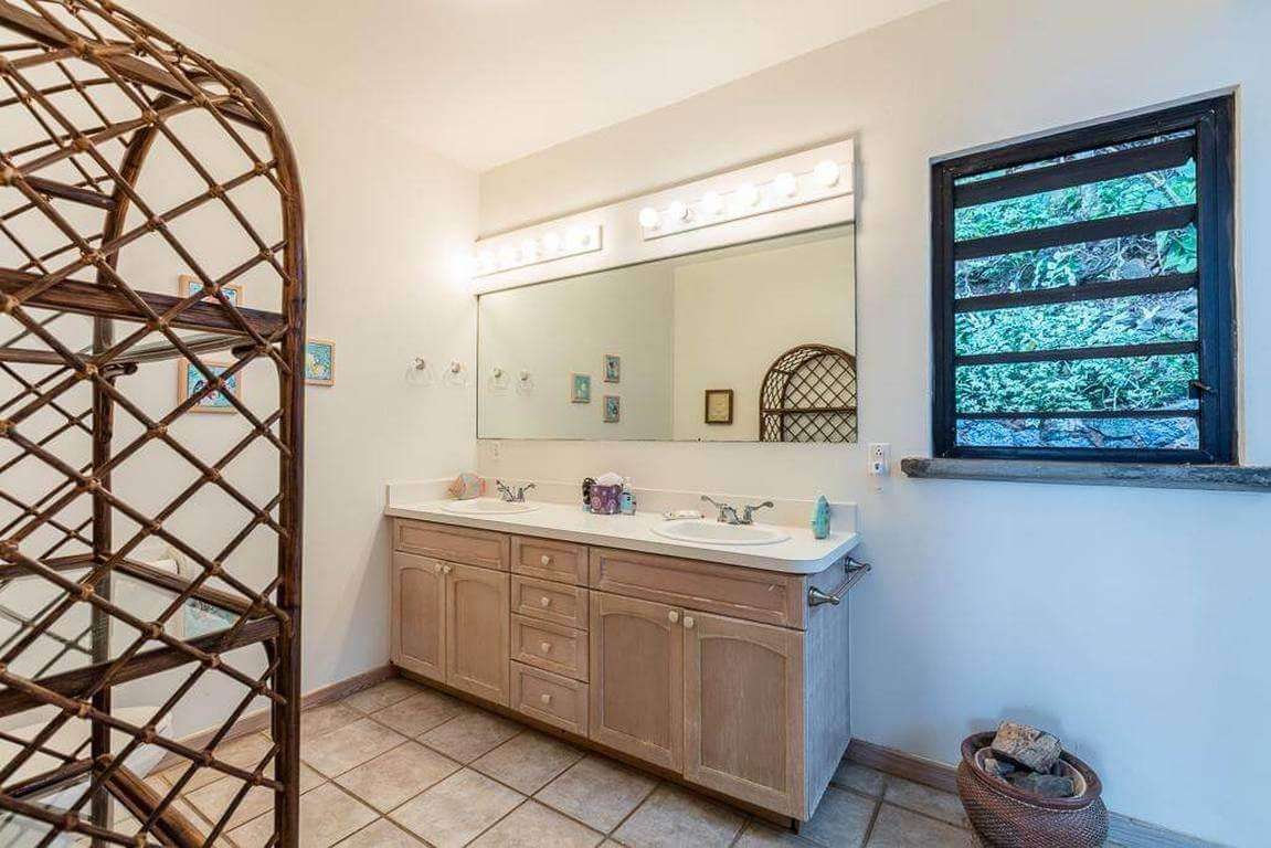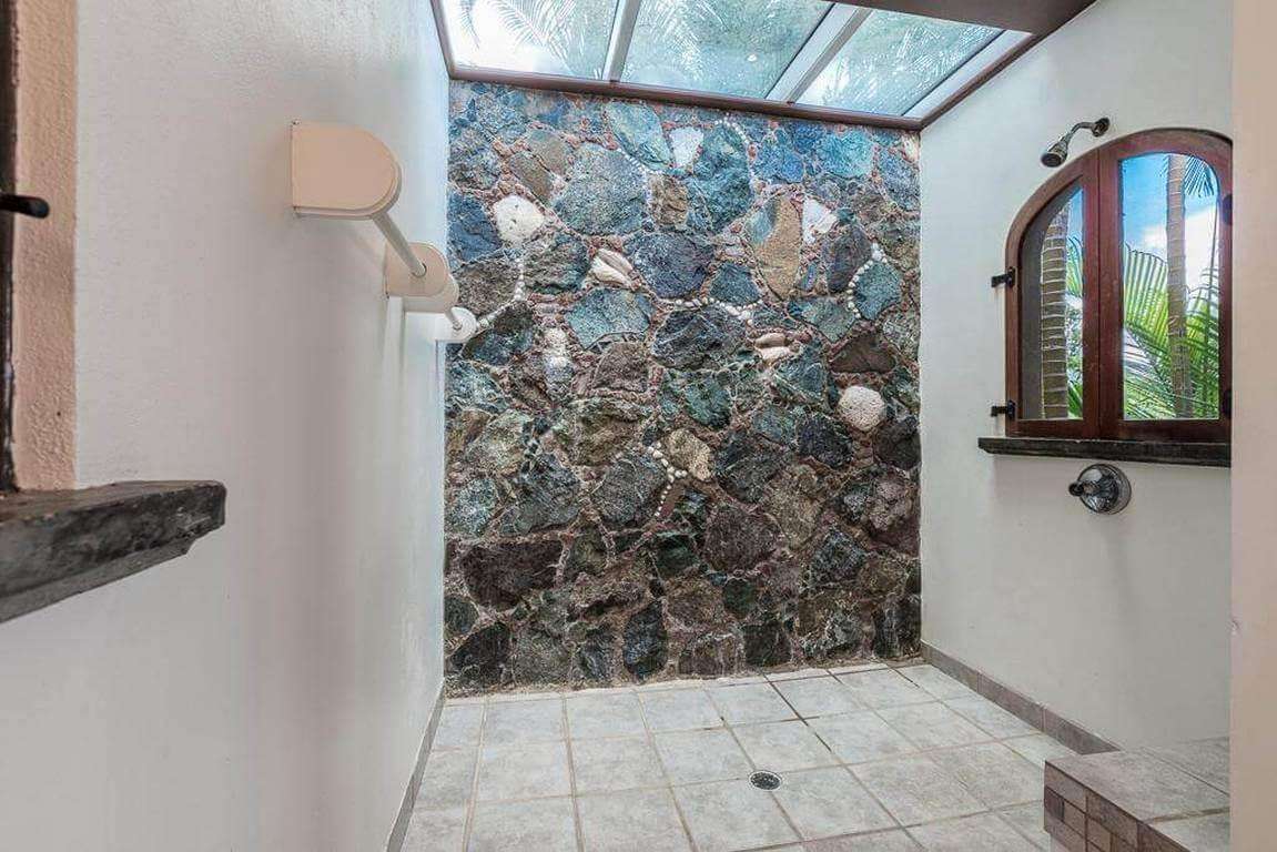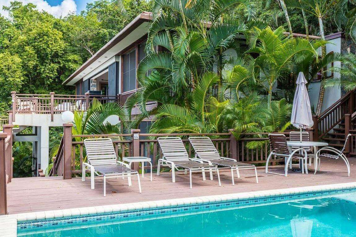 Anole is built on two levels. The great room and two bedrooms/baths, plus a half bath are on the upper level, and two more bedrooms/baths and the pool are on the lower level. You park on the upper level and as you enter the great room the first thing you see is the gorgeous view of Cinnamon Bay. The kitchen and interior dining are on the right side, while the living area occupies the left half of the great room. A tiled sundeck is off the great room, and exterior stairs off the sundeck lead to the pool and the lower bedrooms. The lower bedrooms also offer lots of privacy, with a covered deck located between them. The pool sits in a very private, lushly landscaped spot on the west (left) side of the house and can be accessed by stairs from the house or the entrance area.