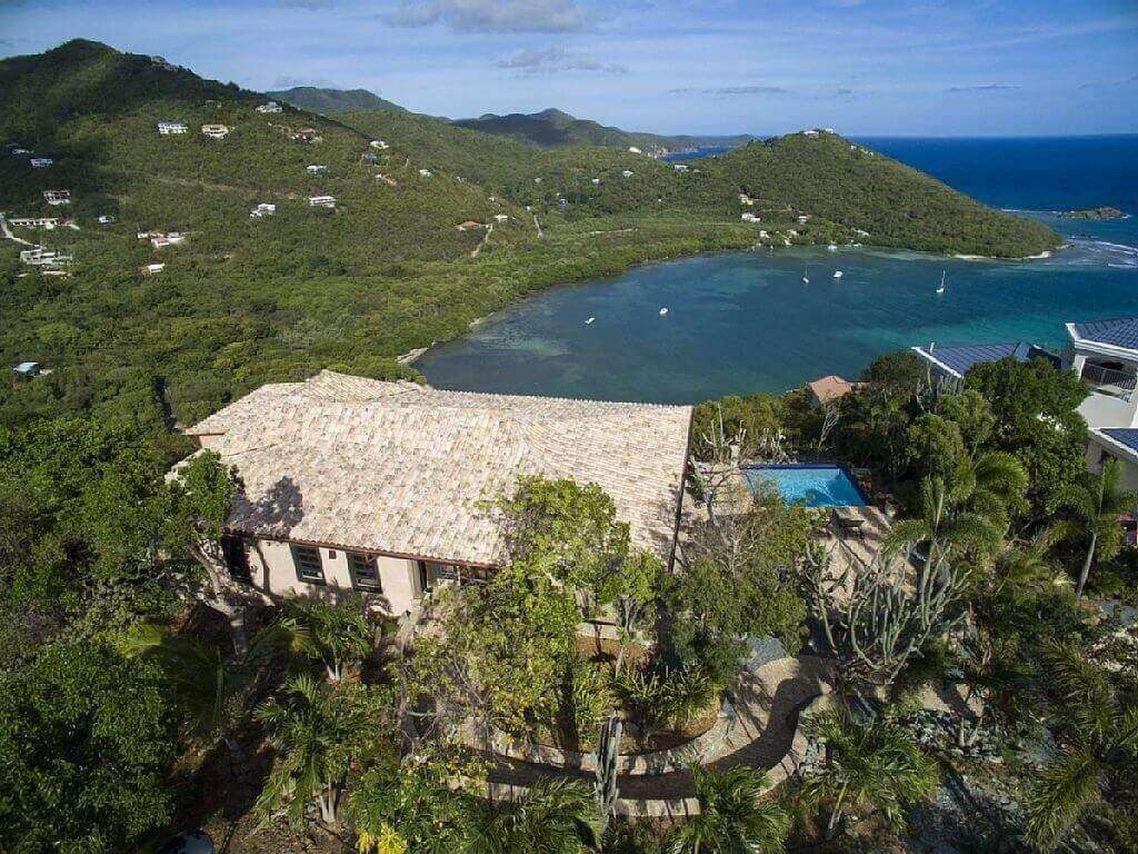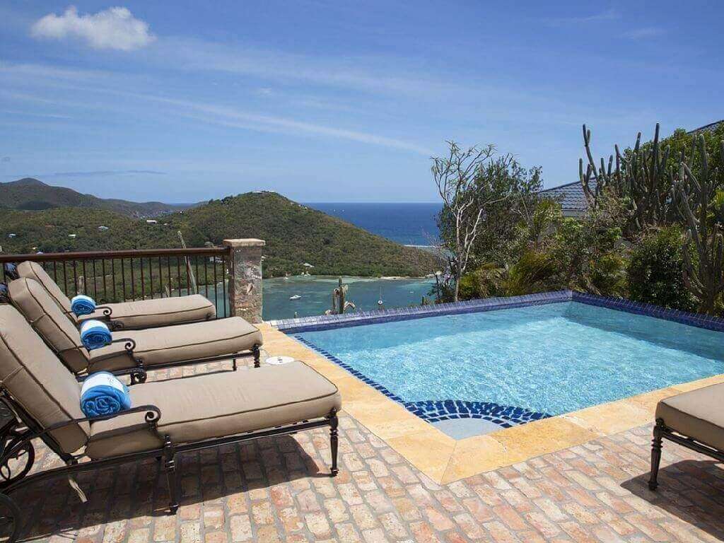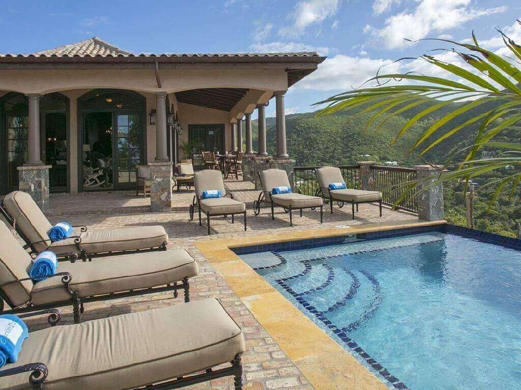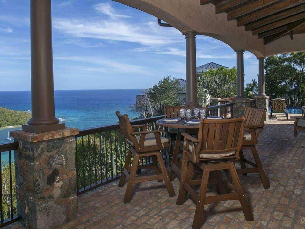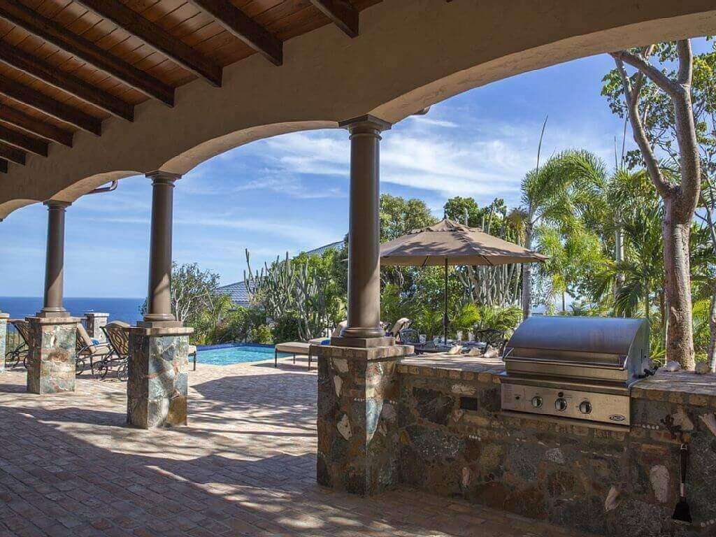 The 750 sq ft of covered veranda with constant trade wind breezes and views of 3 bays, is located one step down from the great room. The pool and the 800 sq ft pool patio are finished with genuine Chicago Pavers and located one step down from the covered veranda. The covered veranda which wraps the villa on 2 1/2 sides allows you to enjoy the 270 degree views without the sun or rain forcing you indoors. There is a built in grill, set in the native island stone work, located on the veranda close to the kitchen and the pool.