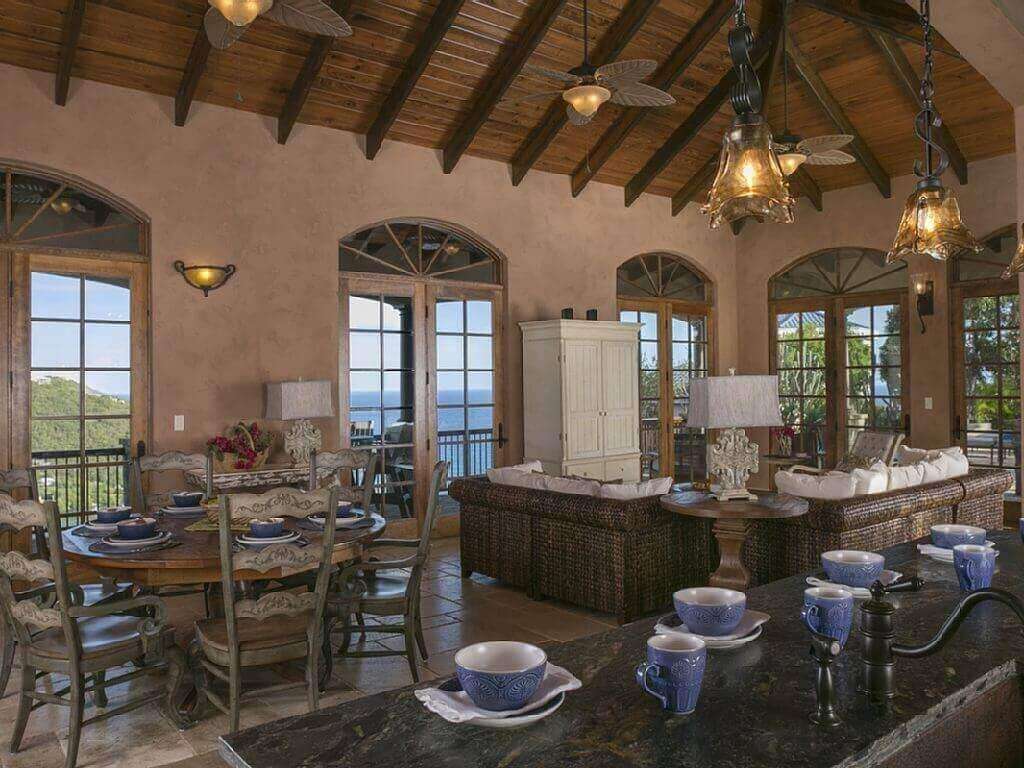 The gourmet kitchen also features ocean views, granite, stainless steel appliances and is fully stocked with cooking utensils to ensure you will have every thing you need to cook your favorite meal. Just off the kitchen is the great room with 18 ft vaulted tongue and groove cypress cielings and the Caribbean Sea beyond. Lounge in the great room and enjoy the view over Fish Bay and Rendezvous Bay through the 10 ft French doors that wrap the great room on two sides.