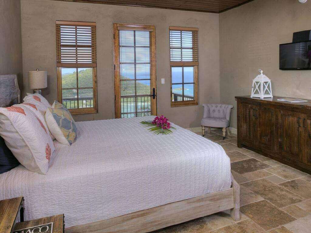 Caribbean Palm Villa is professionally landscaped with multiple natural stone out croppings and native cactus mixed in to add to the appeal of this villa. Beyond the tremendous rock out croppings is beautiful Fish Bay and the Caribbean Sea. Caribbean Palm Villa also features native stone walls throughout the entrance and the veranda.