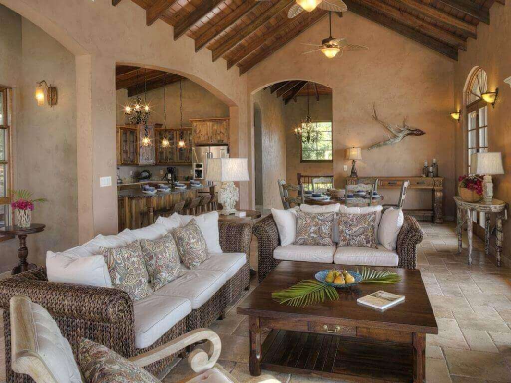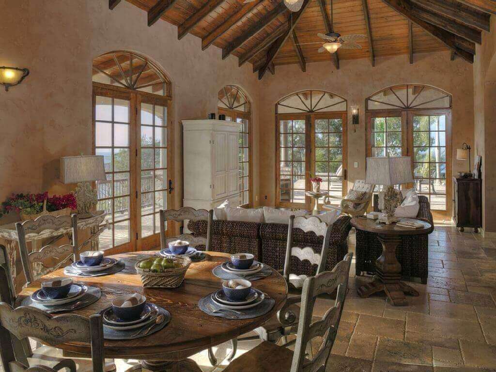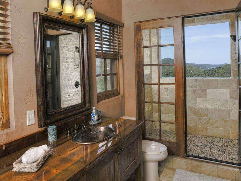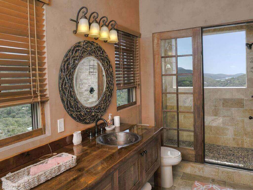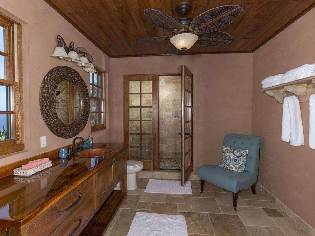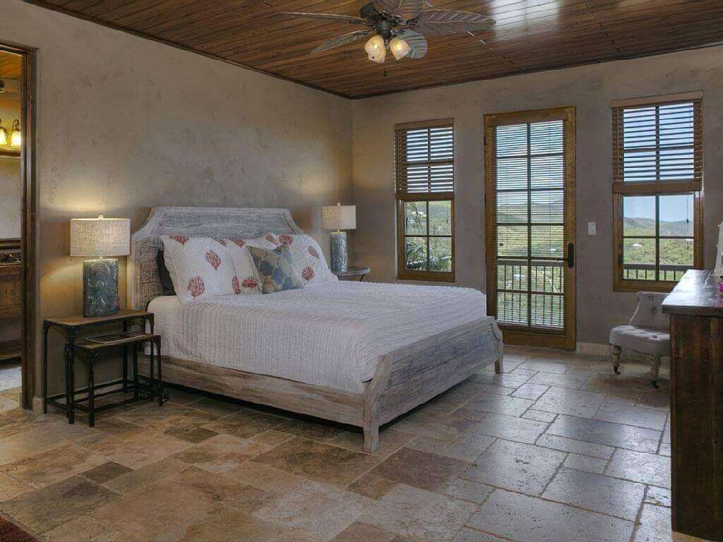 The decor of the villa is an elegant yet rustic theme which mimics a Mediterranean/Tuscan villa that has met the Caribbean. Travertine floors, tongue and groove cypress cielings with exposed beams, reclaimed Chicago Brick Pavers on the veranda and pool patio, and reclaimed barnwood custom cabinetry. All doors in the villa are 8 ft reclaimed barnwood. The bedrooms have vintage vanities and high end finishes in each room.