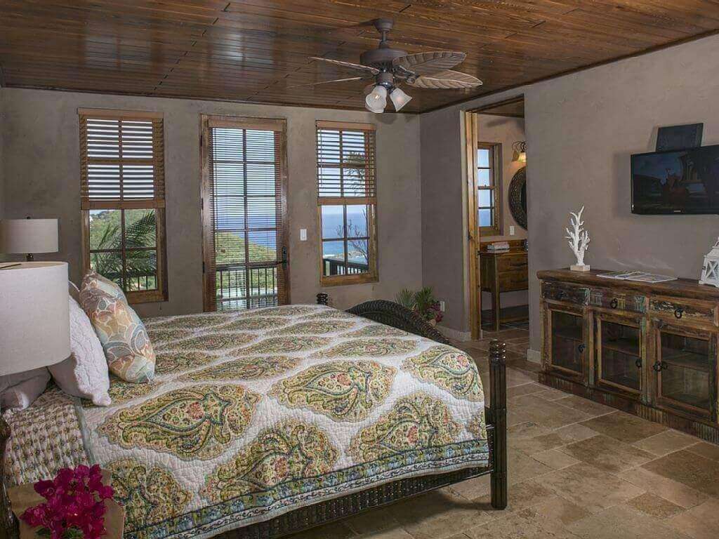 Three equal-sized master bedrooms each with AC and king beds will guarantee that each guest has a wonderful room – all with bay and ocean views. Each master suite has a private balcony, satellite television and cieling fans. Imagine taking a shower with the tradewinds blowing on you and an ocean view.