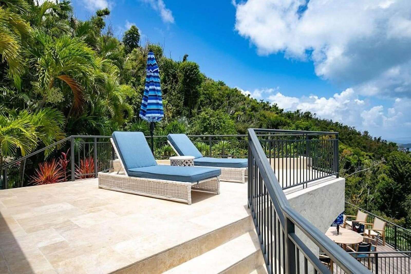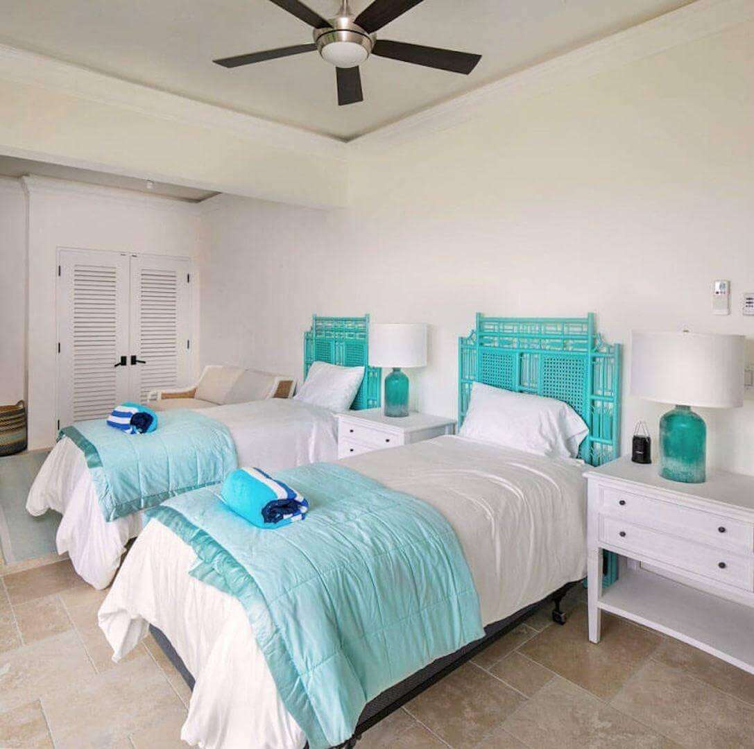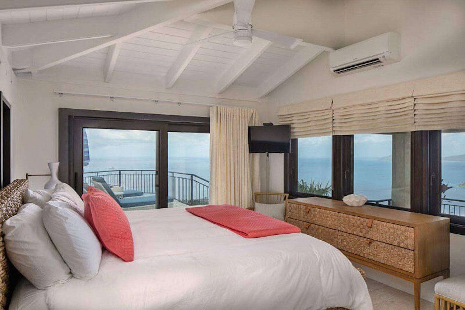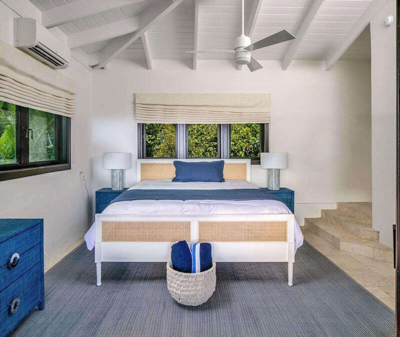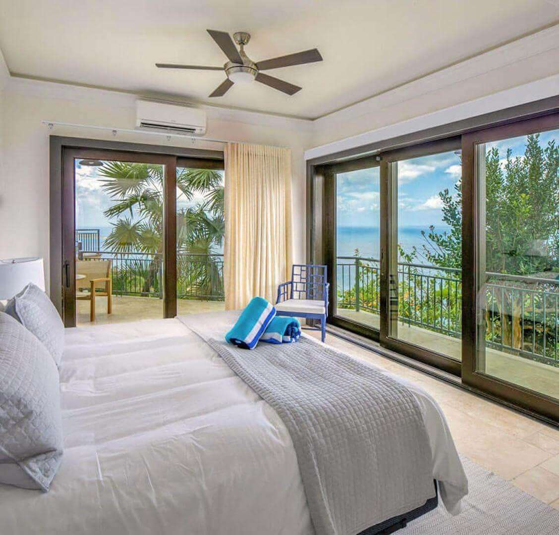 Bedroom Details: Each of the 5 spacious bedrooms (4 kings, 1 set of twins) has some unique features, but all enjoy truly lovely views that you'll fondly remember. All also have screened sliding glass doors that open to gentle breezes, and cozy private decks that are perfect for evening cocktails or tranquil Caribbean mornings. Two of the bedrooms are located on the upper level while an inside stairway leads to the lower 3 bedrooms. All bedrooms are equipped with a cable color TV/VCR, and all have a private tiled bath and shower.