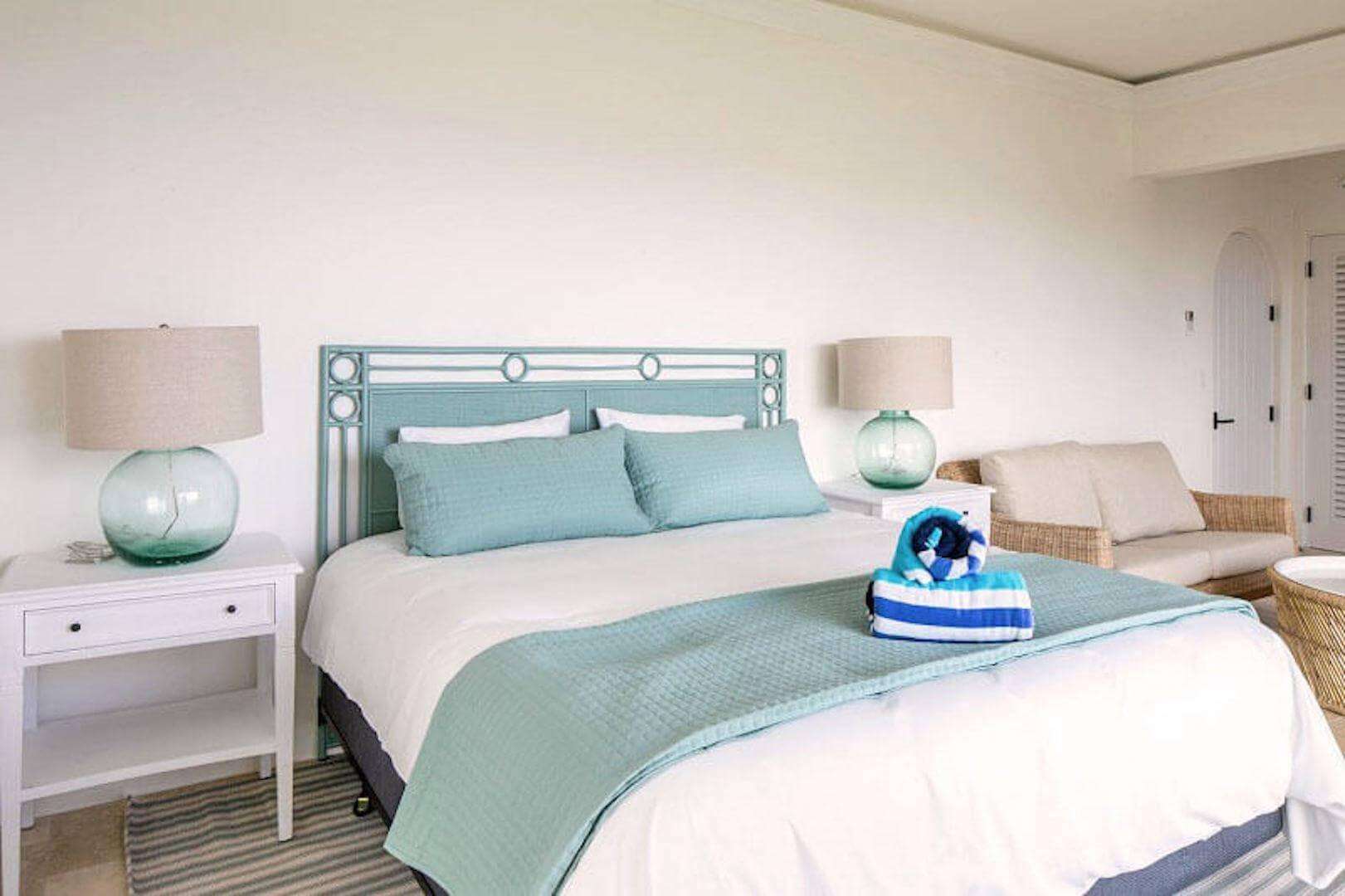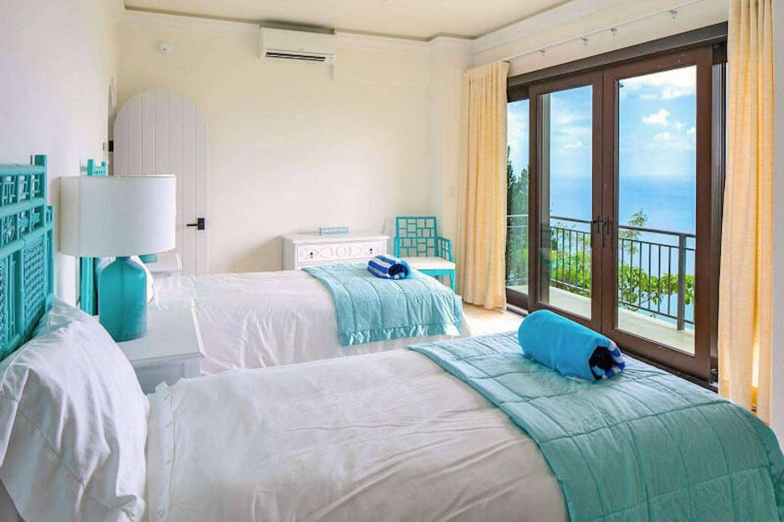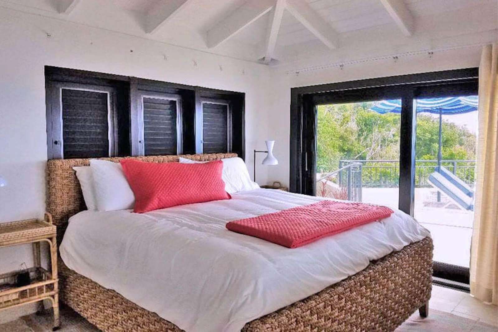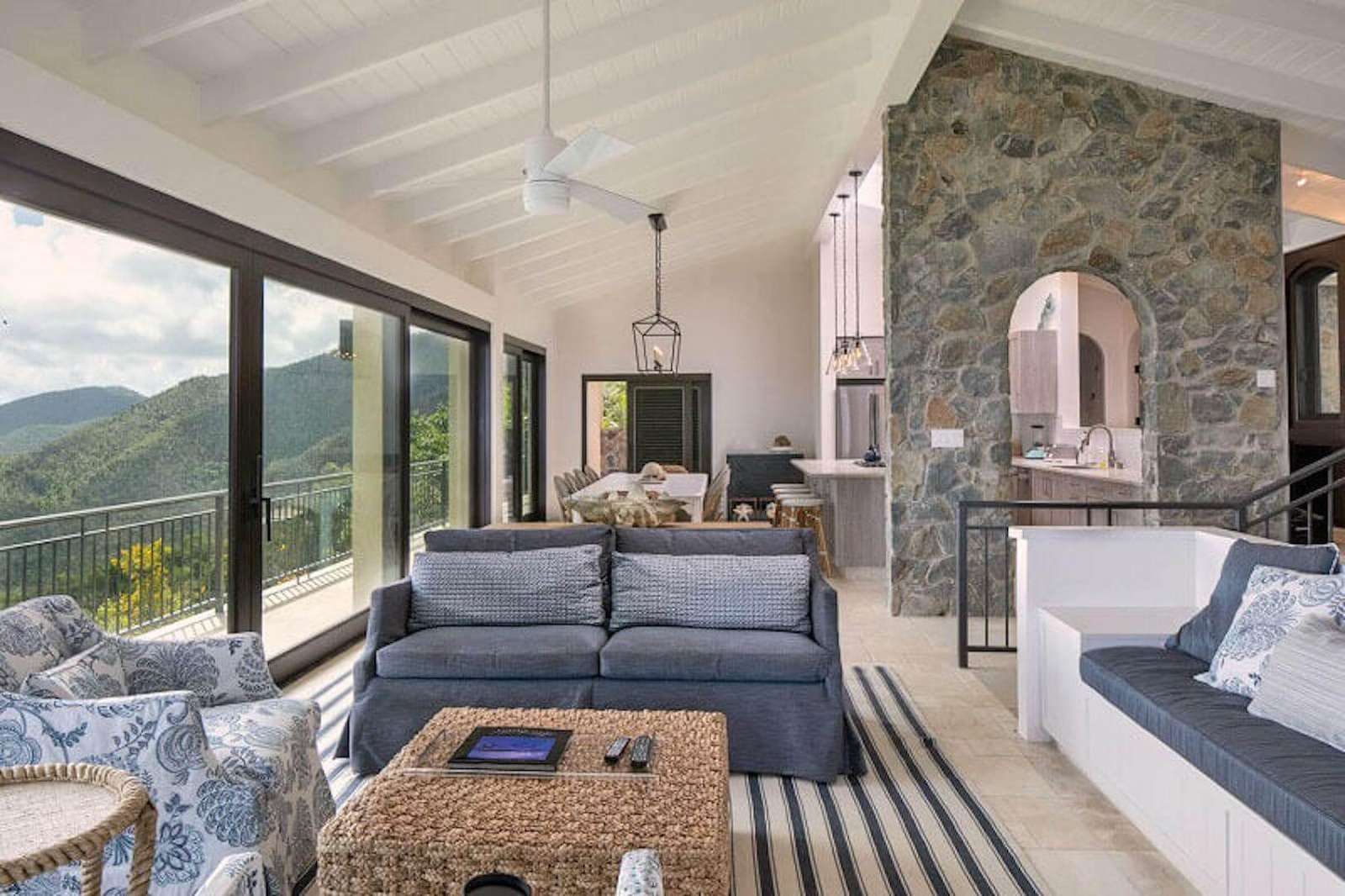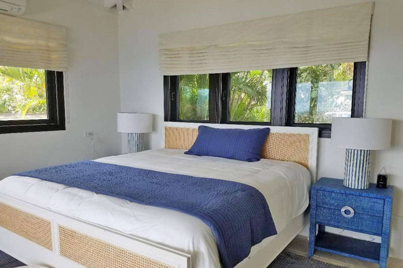 Bedroom Details: Each of the 5 spacious bedrooms (4 kings, 1 set of twins) has some unique features, but all enjoy truly lovely views that you'll fondly remember. All also have screened sliding glass doors that open to gentle breezes, and cozy private decks that are perfect for evening cocktails or tranquil Caribbean mornings. Two of the bedrooms are located on the upper level while an inside stairway leads to the lower 3 bedrooms. All bedrooms are equipped with a cable color TV/VCR, and all have a private tiled bath and shower.
