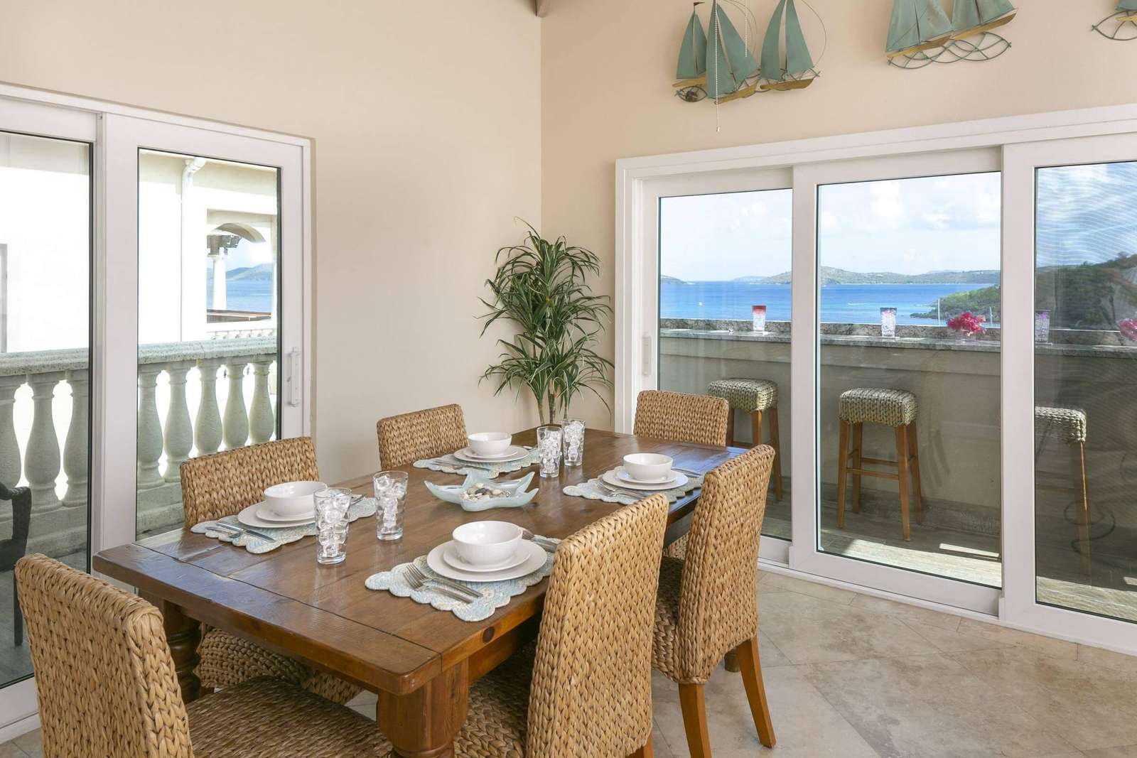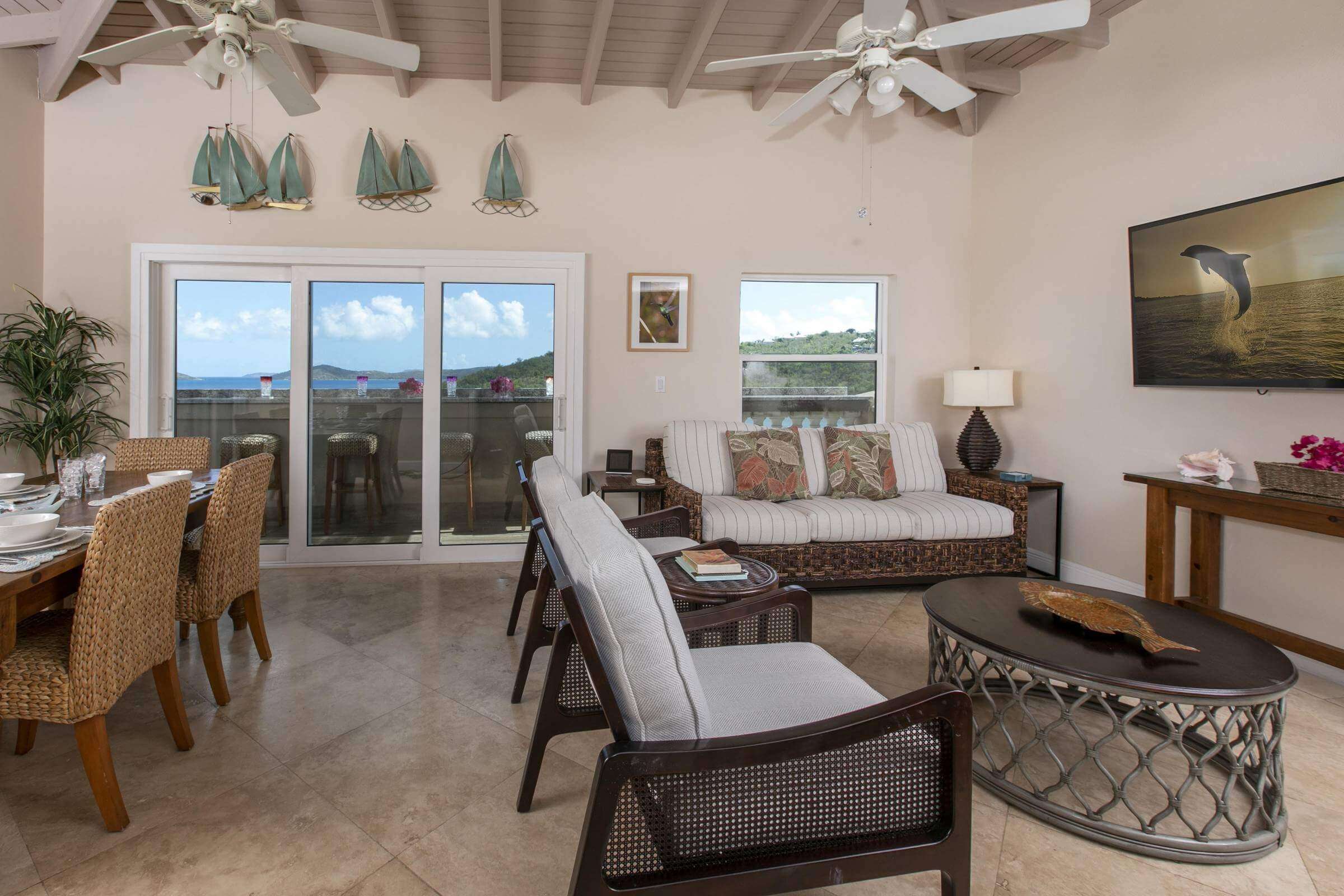 Newly Renovated Luxury Condo: The condo has the best views in an upper building, set back on the 3rd floor with elevator access, allowing guests to enjoy awesome unobstructed Sea and Bay views in a quiet environment (Hurricane Windows) and very close to the resorts pool, hot tub and sun deck. Relax on the homes private 2 terraces – one wrap around balcony with beautiful unobstructed views of the Cruz Bay and the Ocean. Renovated with new furniture and linens, the home has spacious living room, dining room and kitchen areas.