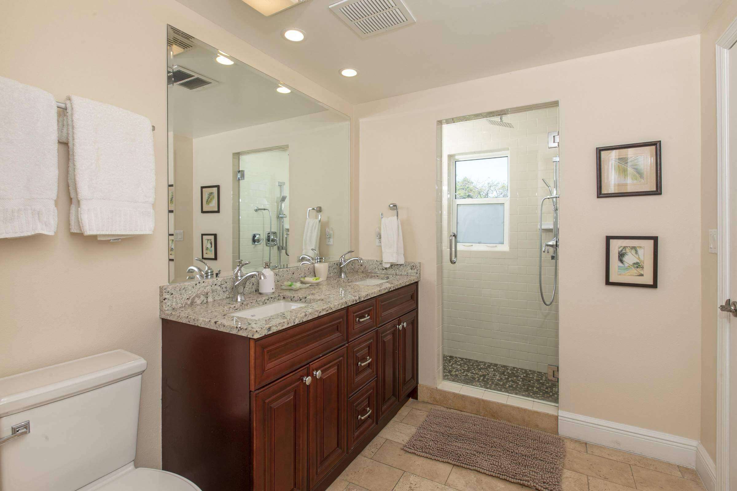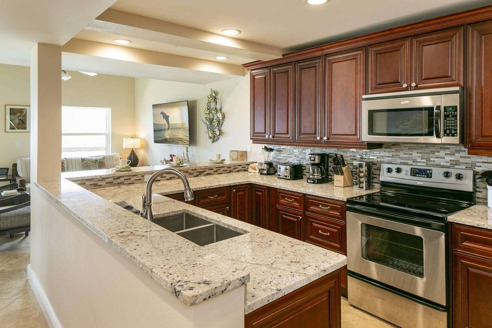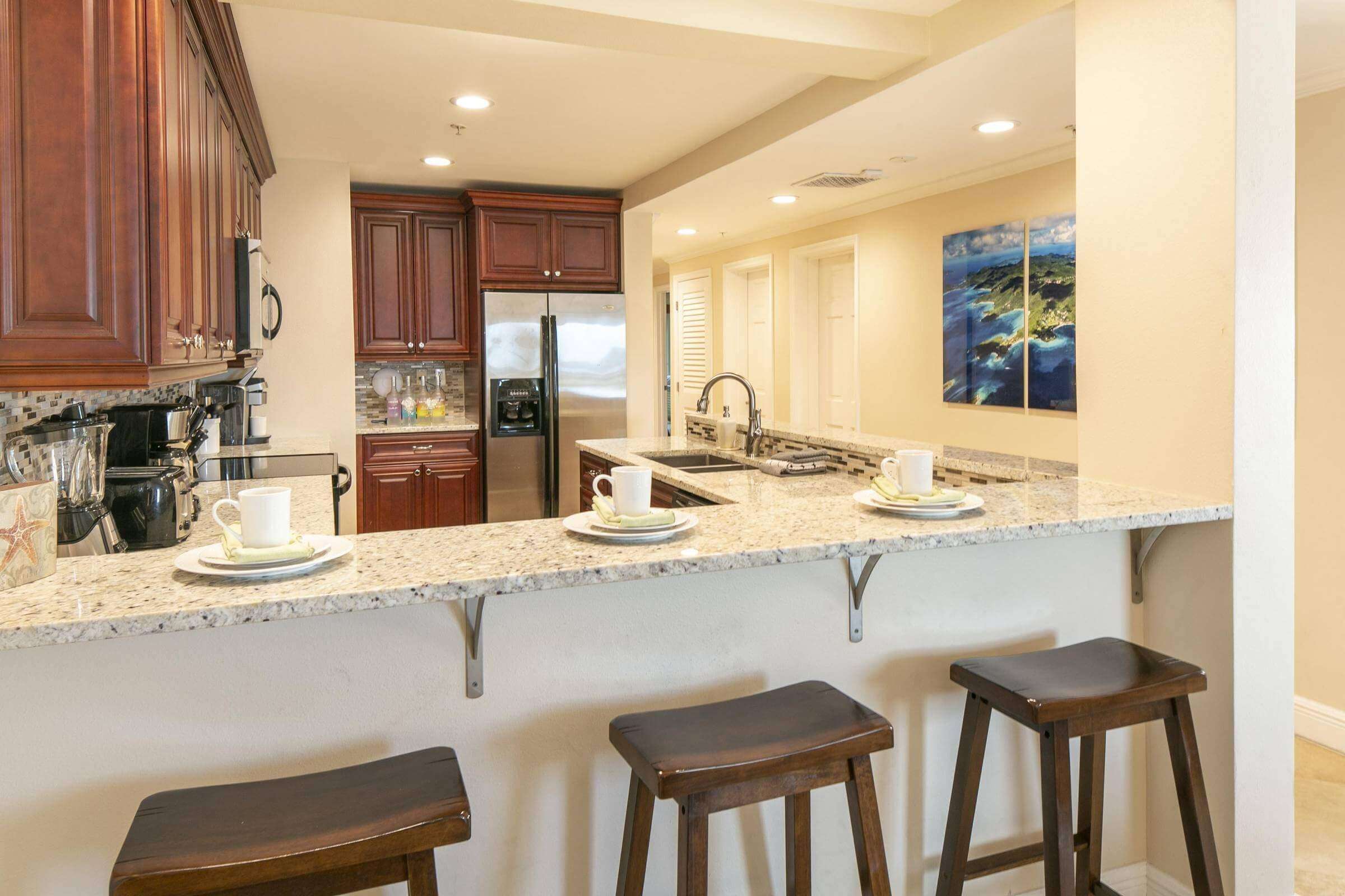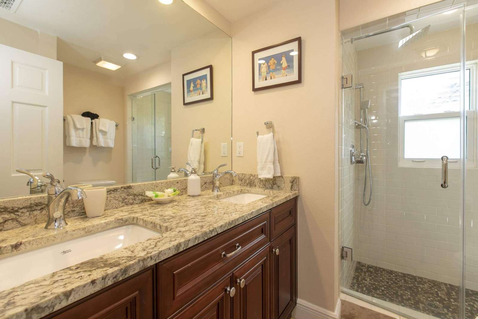 Fully updated and stocked kitchen with refrigerator, dishwasher, stove, range, microwave, blender, coffee maker. Bathrooms have 2 large double sink bathrooms with Rain showers and shower towers with glass doors. Full size washer and dryer.