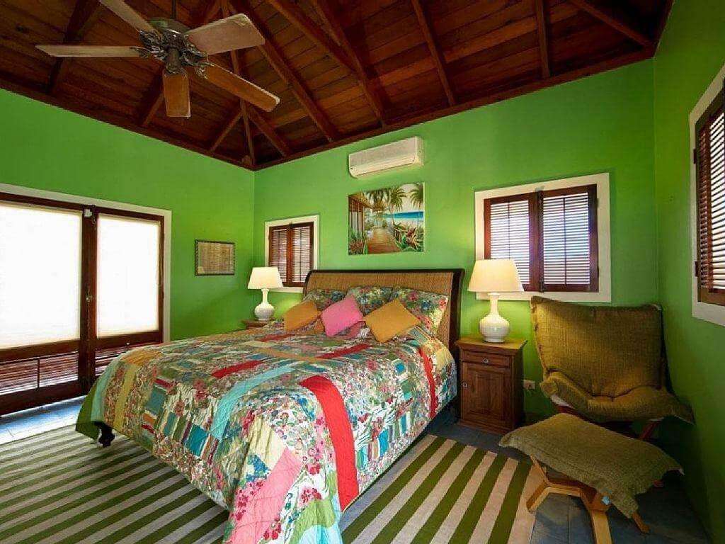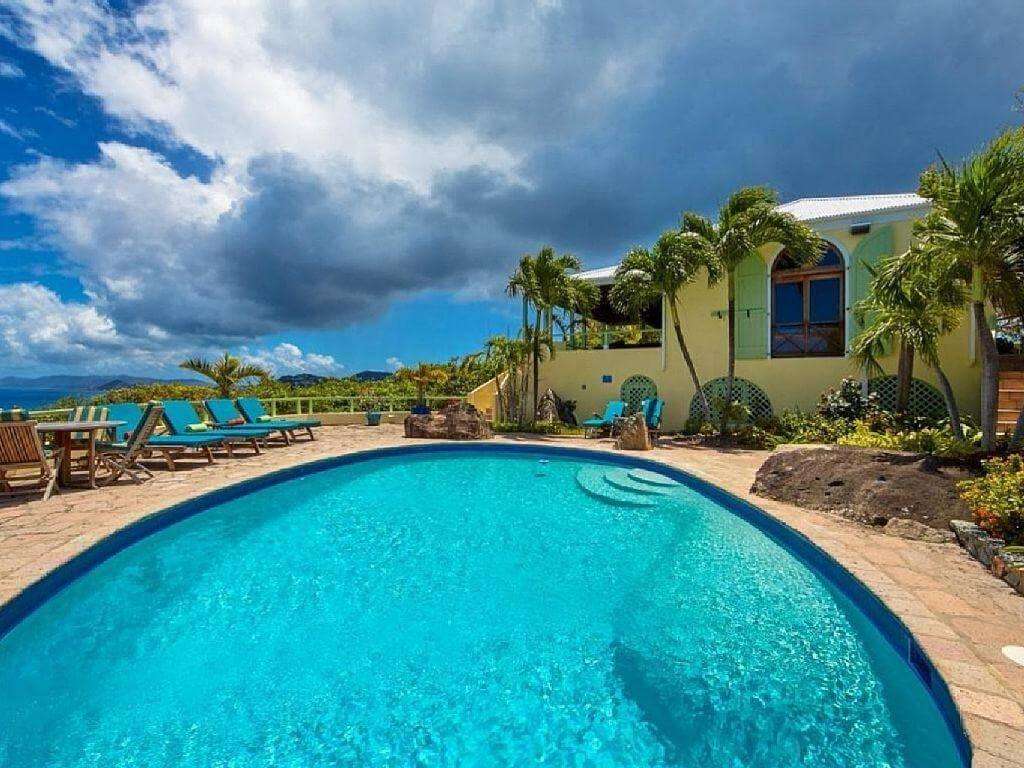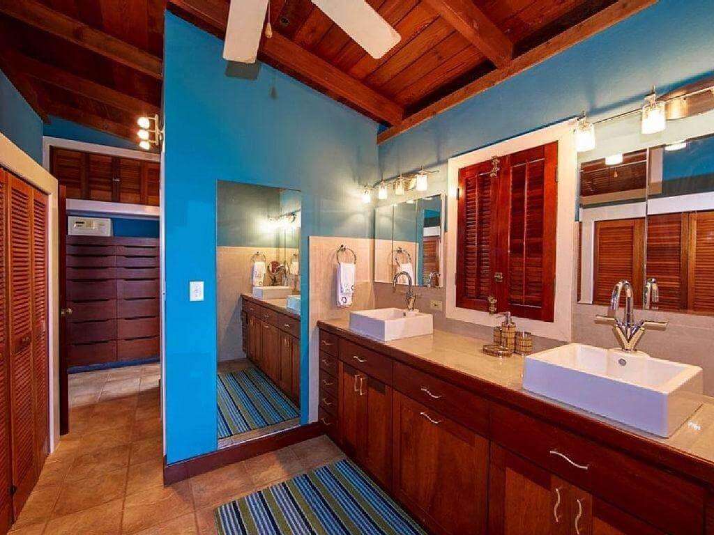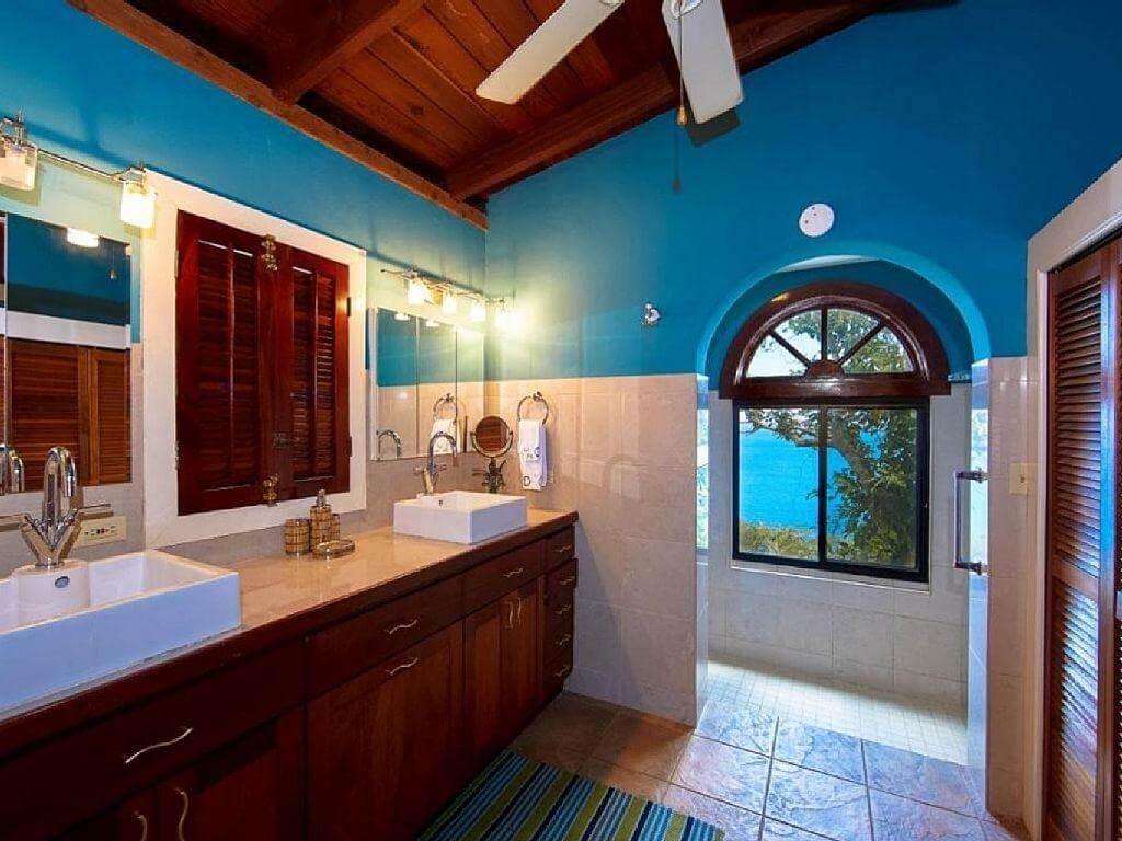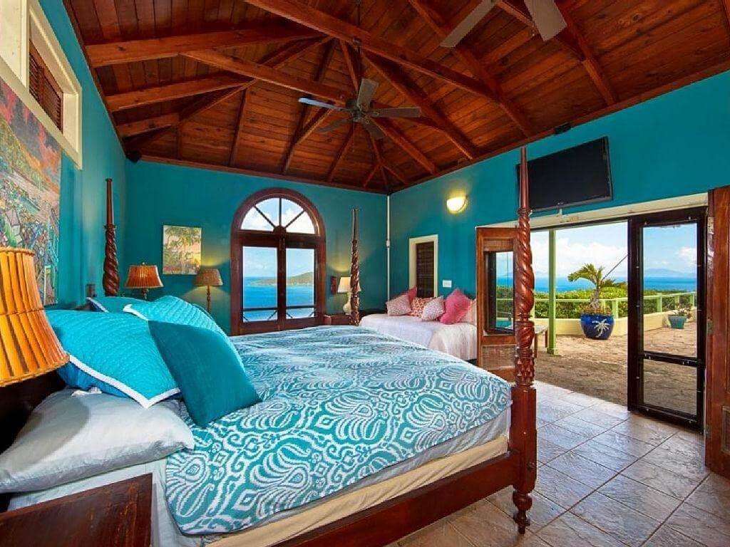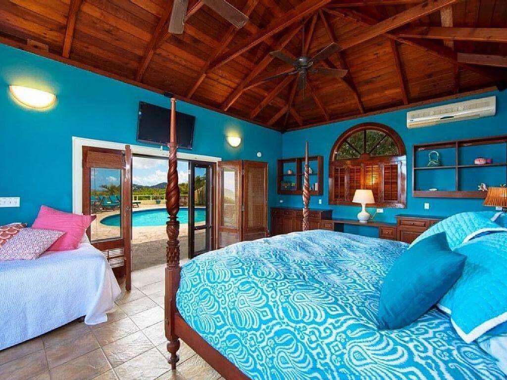 The huge Master Suite (separate and private pod) features a comfortable king sized four poster bed with supple Egyptian cotton sheets, complete with a flat screen TV, Bose Sound System, lounge area with day bed and writing desk that overlooks the large heated pool, sweeping views of British Virgin Islands and a lush tropical garden. The Master Suite affords itself to peaceful tranquility and awe inspiring sunrises. The expansive bathroom offers a majestic walk-in shower with views of the Caribbean Ocean.