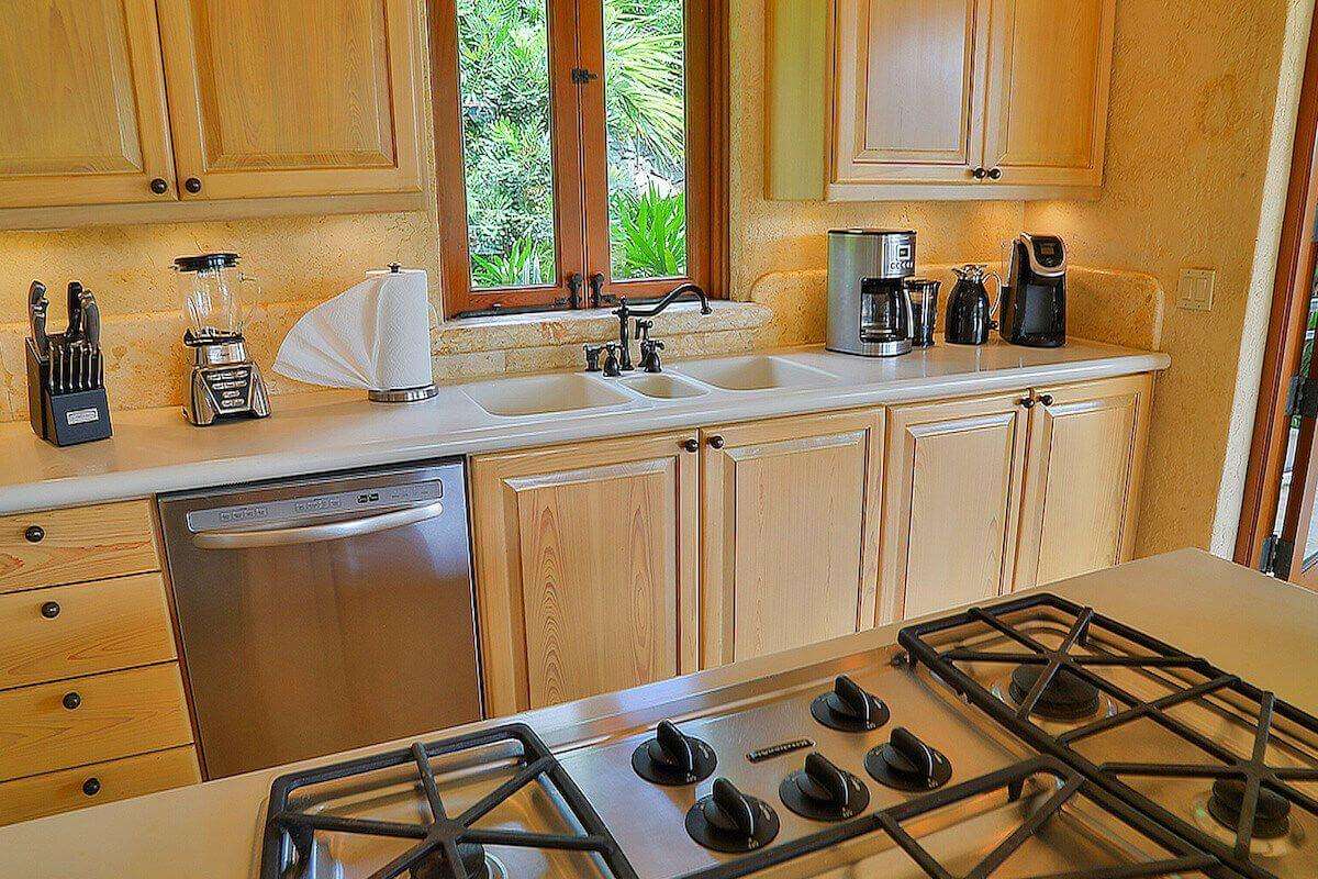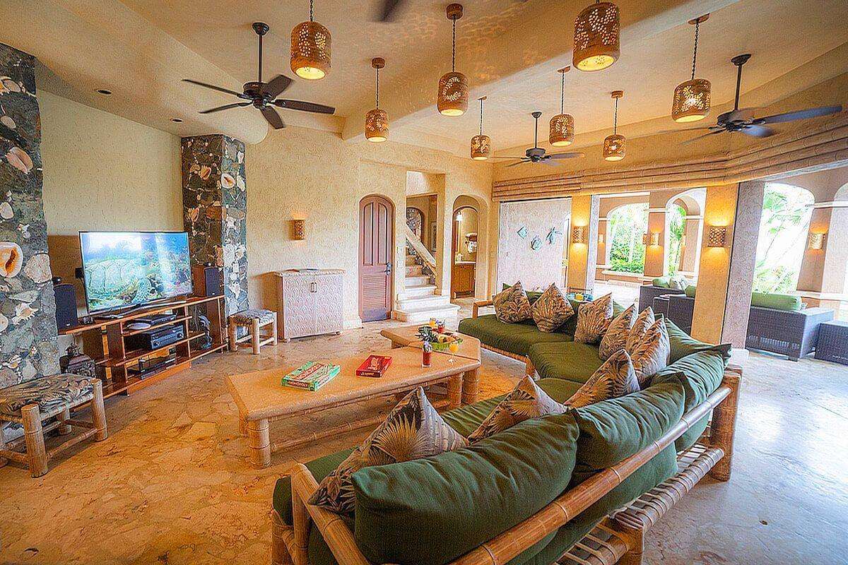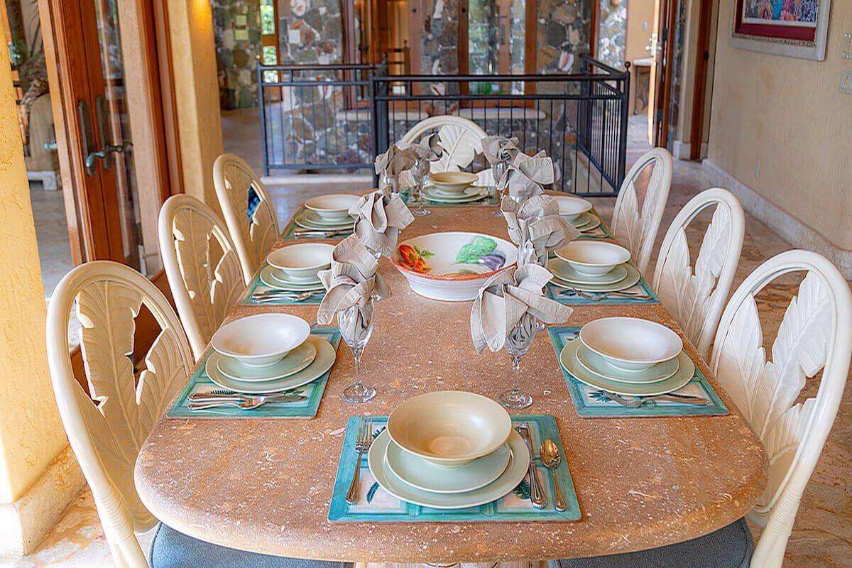 On the main level, the spacious Great Room's high ceilings, custom hand carved cypress furniture, and sectional sofas share space with dining areas and a wonderful custom kitchen outfitted with stainless-steel appliances including two refrigerators, a gas cooktop, double ovens, Calphalon cookware and a generous collection of tableware. French doors open out to Seacove's upper terrace which overlooks enchanting blue ocean views.