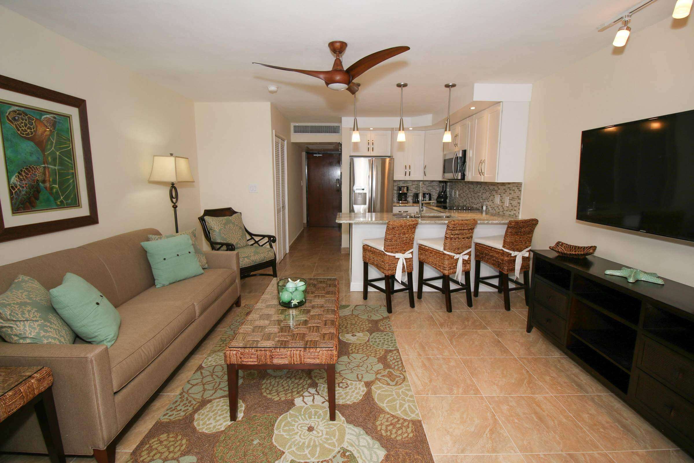 The condo was exactly as featured—beautiful kitchen, excellent views out to the ocean, clean—all very nice. Upscale appliances, two nice balconies to sit outside, very nice bathrooms, comfortable bed. The beach is really nice—also clean and quiet, with a great bay to swim and snorkel. For some reason, I thought there was an on-site restaurant, but there is a little beach bar nearby and a little temporary food stand close by. The building next door is being renovated on the outside, which made some time during the day a bit noisy with jackhammers etc, but inside the condo, you couldn't really hear them working, which was nice. The pool area is not great, which is not the condo owner's fault, but the pool "bar" area is closed, dilapidated, and in need of repair. The pool itself looks fine, but we did not use the pool at all. I would for sure stay here again. The condo manager, Amy, was very nice and very responsive.