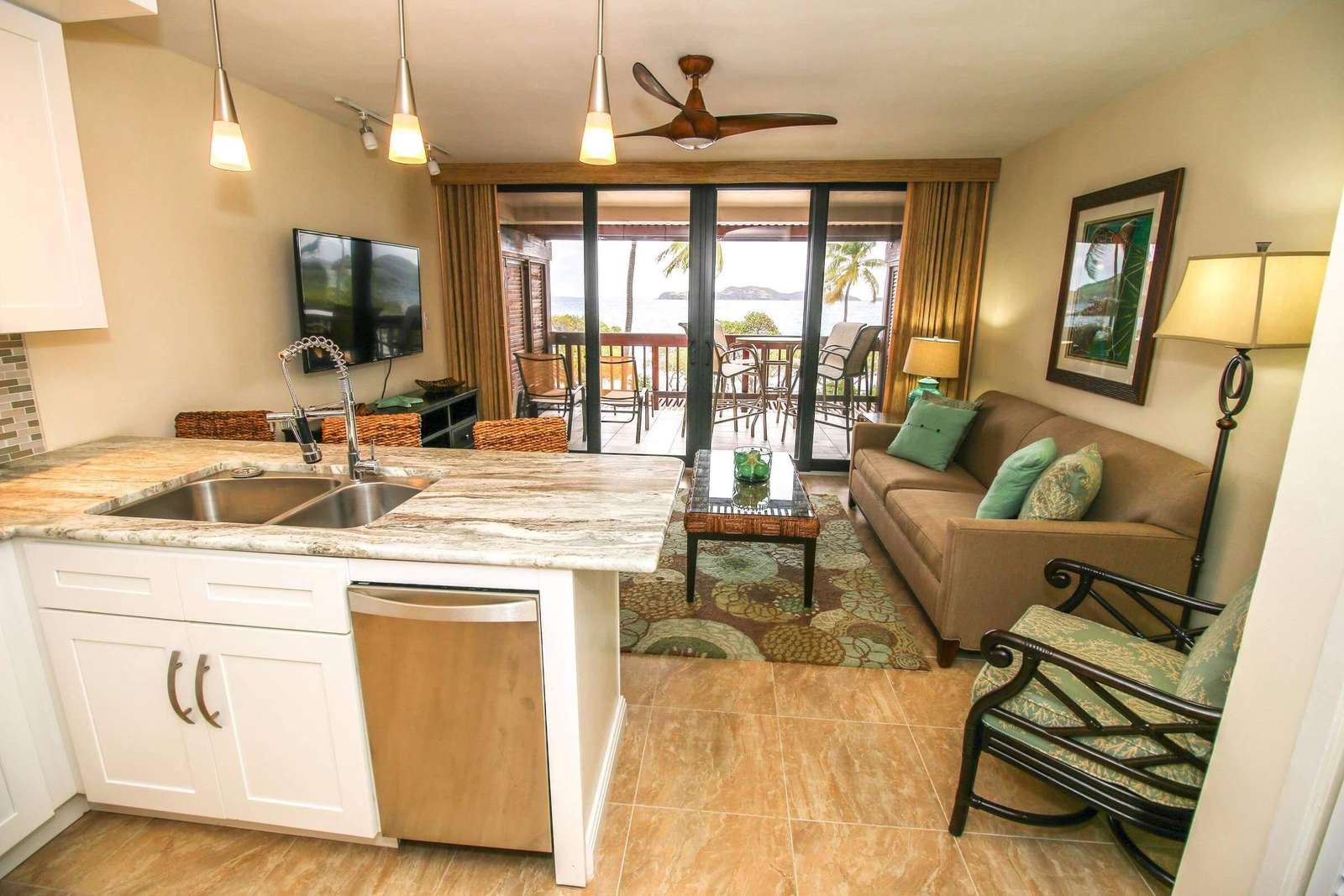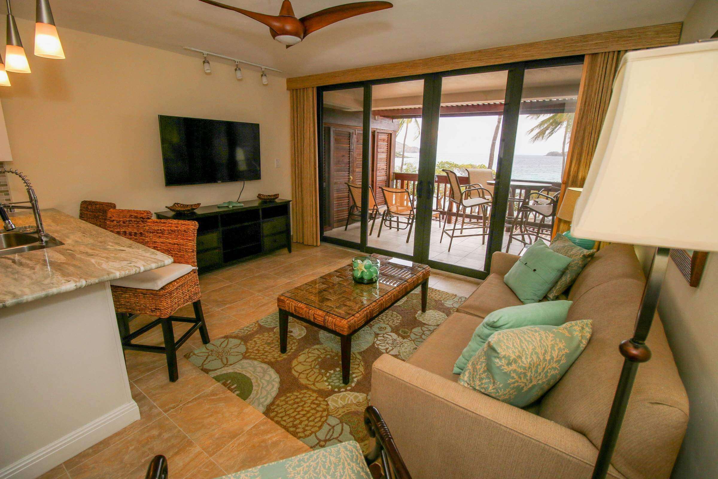 This condo at Sapphire Beach is the most beautiful, clean and completely renovated on both floors. I spent weeks looking for accommodations on St. Thomas and at the Sapphire Beach Resort. Every resort and every condo did not meet my expectations of what I was looking for: location, beach, cleanliness, renovated, ocean view. Except for this one. All of the other resorts on St. Thomas were outdated, dirty and looked like the 1970's. This 2 story condo is breathtaking the minute you open the door. The unit has two huge balconies overlooking the white sand and ice blue water. The furniture is very comfortable and new, the white kitchen is gorgeous with all the appliances and accessories you will need, 2 huge renovated bathrooms (one on the main floor and one upstairs), air conditioning and ceiling fans. The resort is beautiful and quiet. There are no restaurants or bars so at night it is very peaceful. Red Hook is a 2-3 minute drive from the resort for dinner, drinks, fresh market grocery store or taking the ferry to St. John. The entire experience staying at this condo was above and beyond. It is a 2 story condo, absolutely beautiful, peaceful, gorgeous ocean views and feels just like home. We can't wait to go back and this will be the only place we rent. The property management company, Sea Glass Vacations, who books for the owners, is amazing, very personal and helpful. She also mentioned that the owners have 2 other renovated condos so you could inquire about those as well. This condo does not disappoint.
