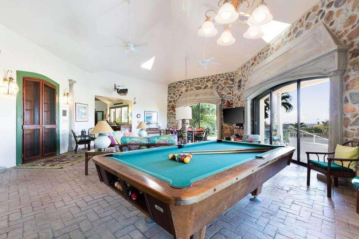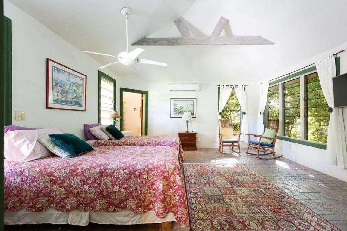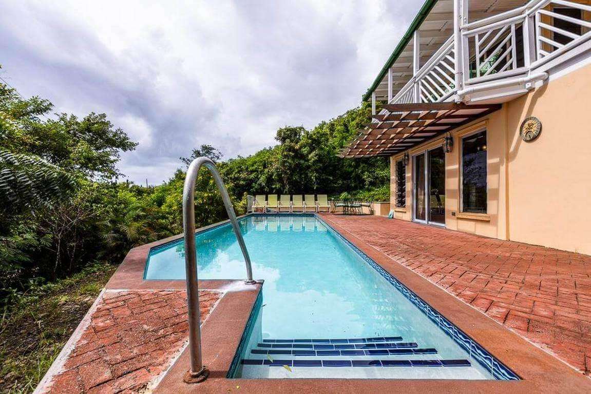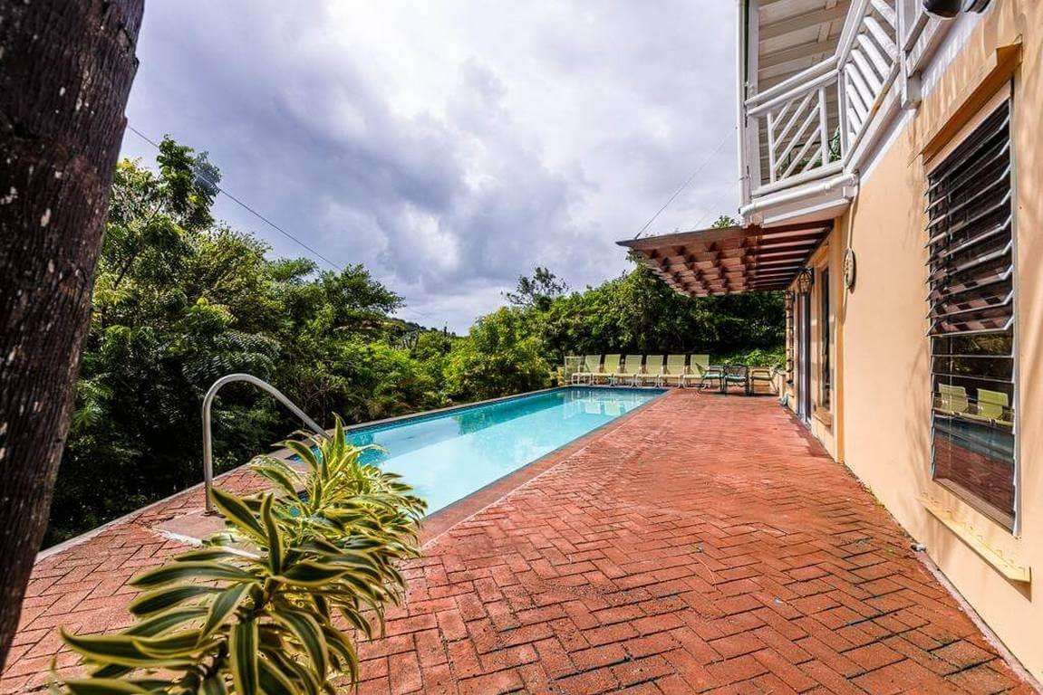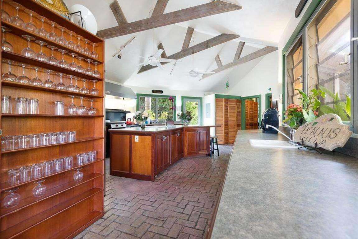 As with the location, the design of this graceful villa is also alluring. Completed in 1995, the one-story custom design is child friendly, spacious and comfortable. Only a few St. John villas combine this much space and privacy with such easy access to so many activities and amenities. Tennis Villa consists of a 3 bedroom/3 bath main house plus a 1 bedroom/1 bath detached pool house. The main house contains a truly gourmet kitchen plus the living and dining areas, while the pool house overlooks the all weather surface tennis court. The arched doorways of the living area of the great house flow into a large garden courtyard that encircles a 43- foot pool. The south-facing courtyard gets all day sun and affords privacy and sunset views.