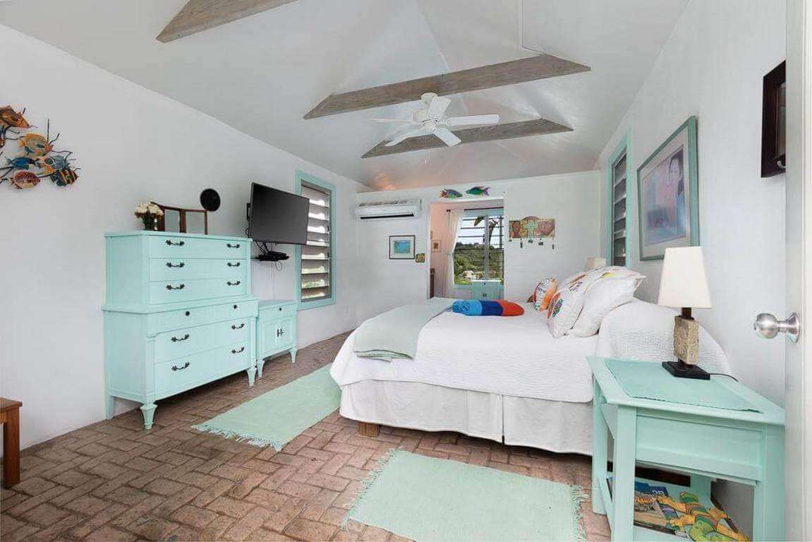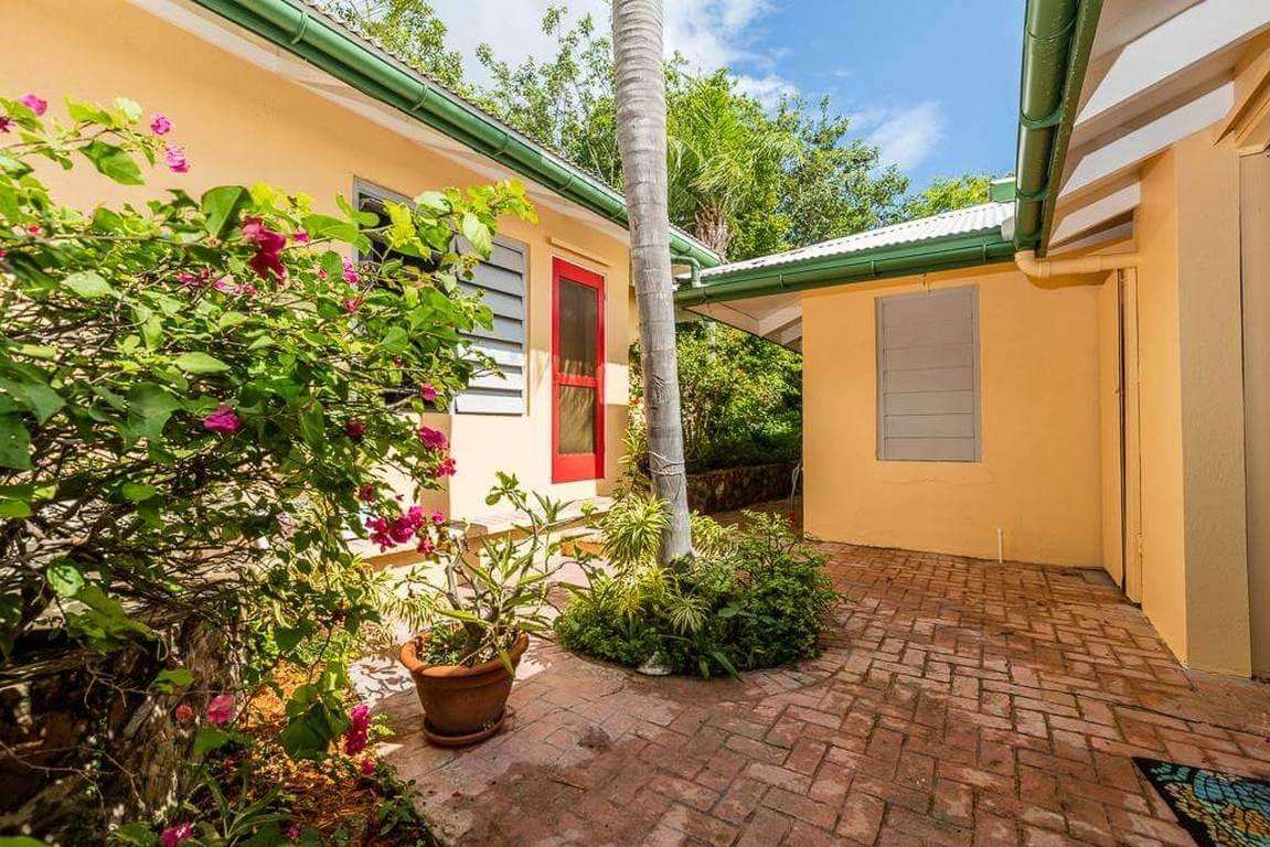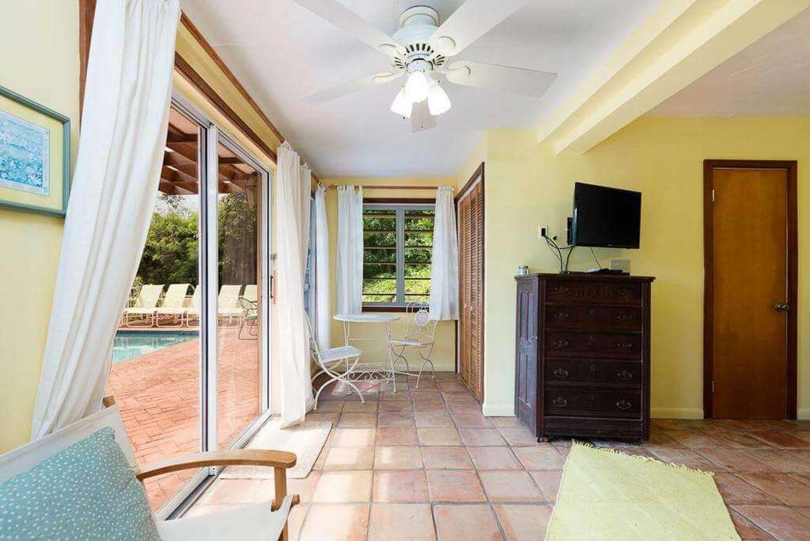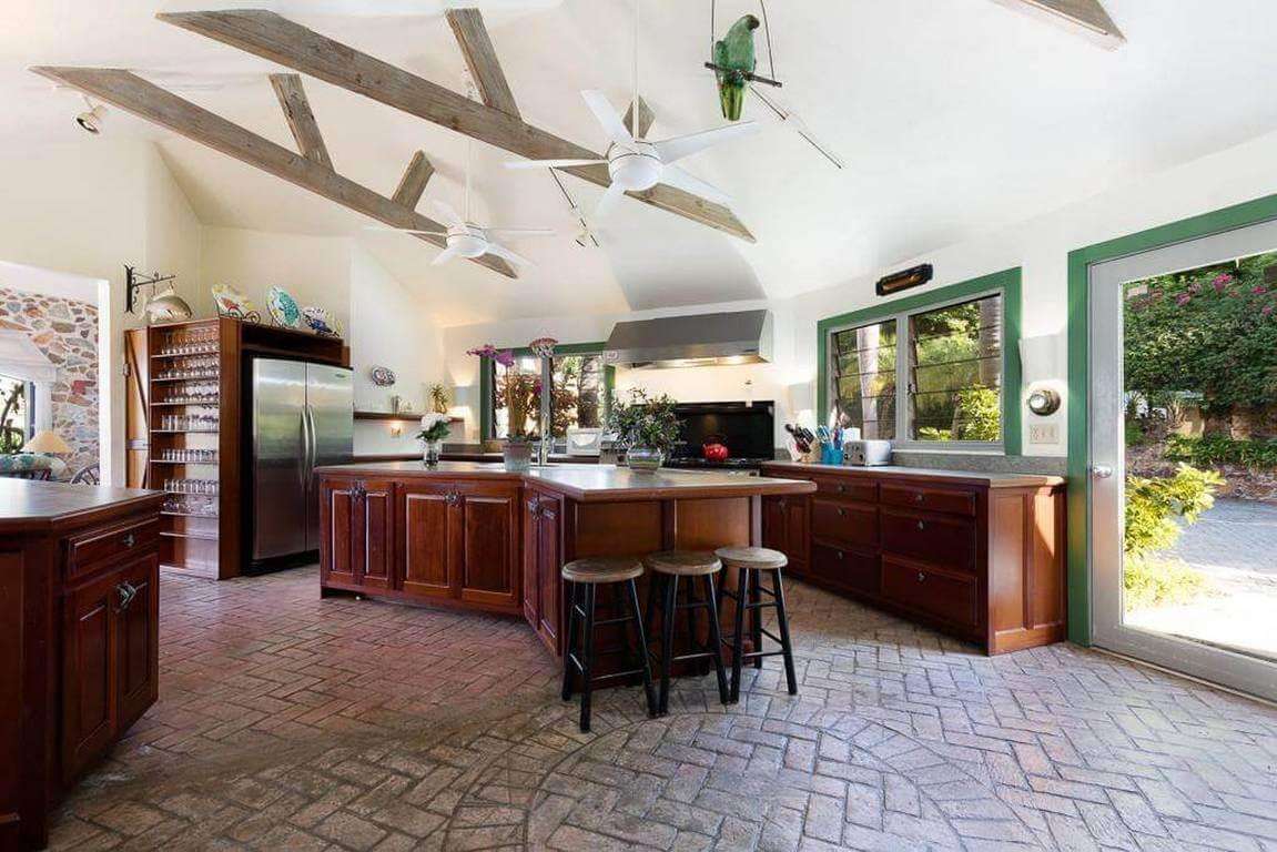 As with the location, the design of this graceful villa is also alluring. Completed in 1995, the one-story custom design is child friendly, spacious and comfortable. Only a few St. John villas combine this much space and privacy with such easy access to so many activities and amenities. Tennis Villa consists of a 3 bedroom/3 bath main house plus a 1 bedroom/1 bath detached pool house. The main house contains a truly gourmet kitchen plus the living and dining areas, while the pool house overlooks the all weather surface tennis court. The arched doorways of the living area of the great house flow into a large garden courtyard that encircles a 43- foot pool. The south-facing courtyard gets all day sun and affords privacy and sunset views.