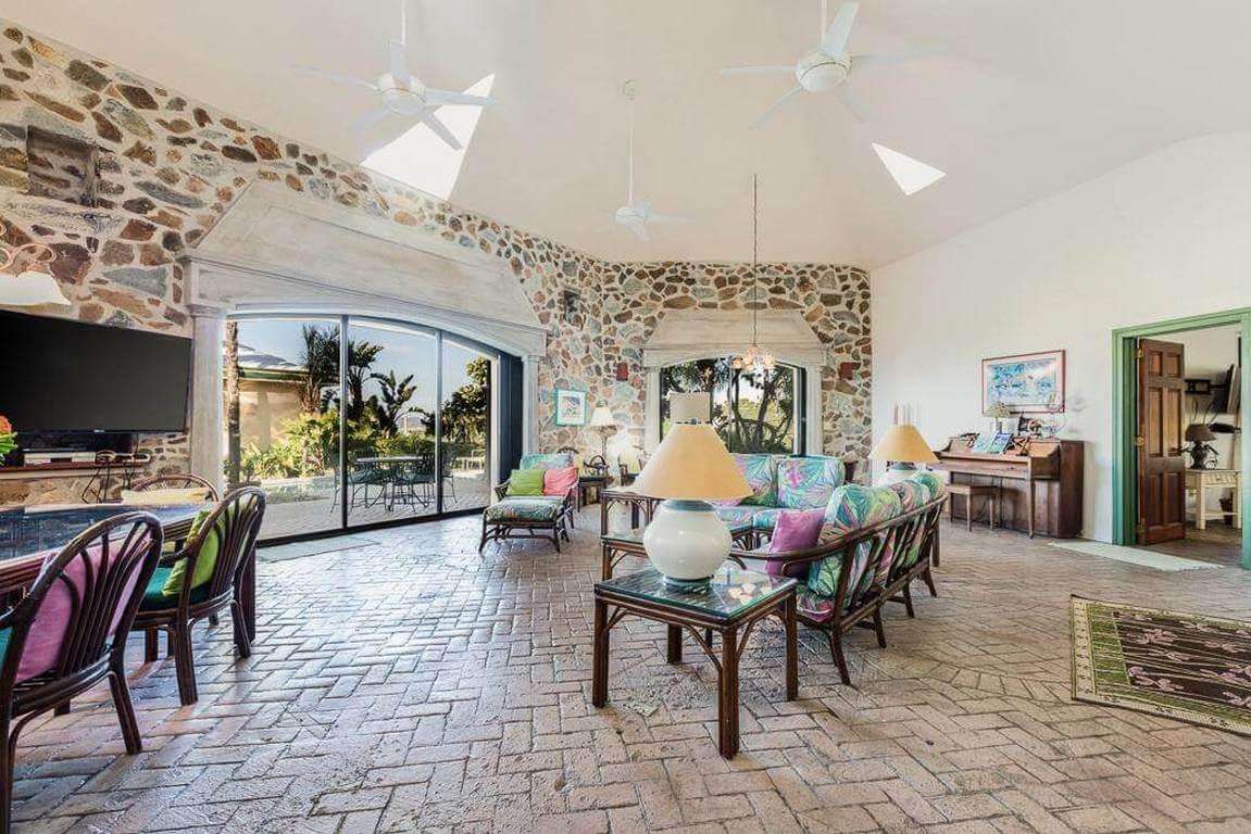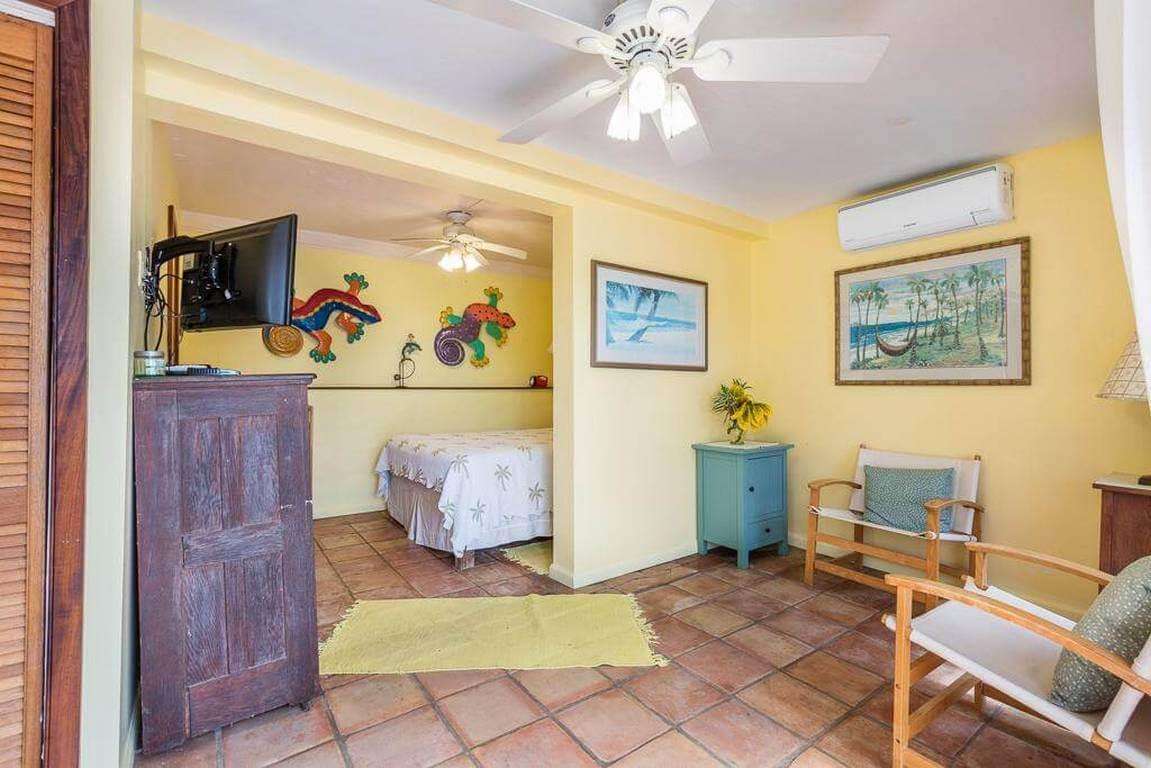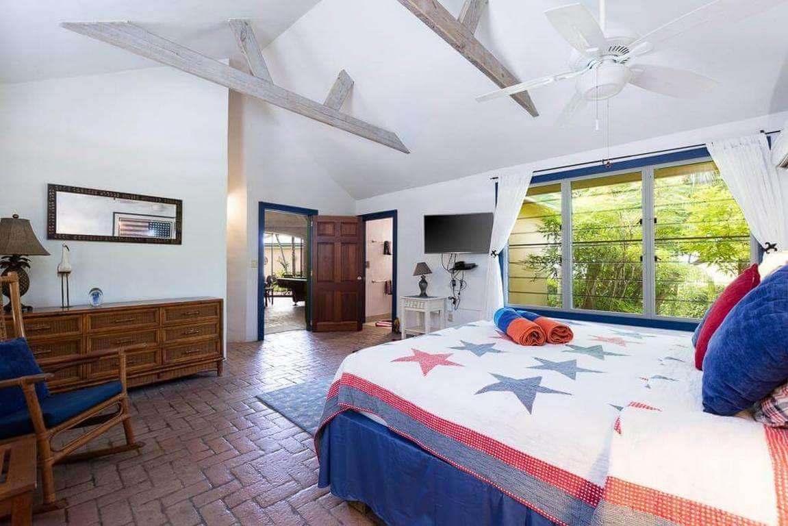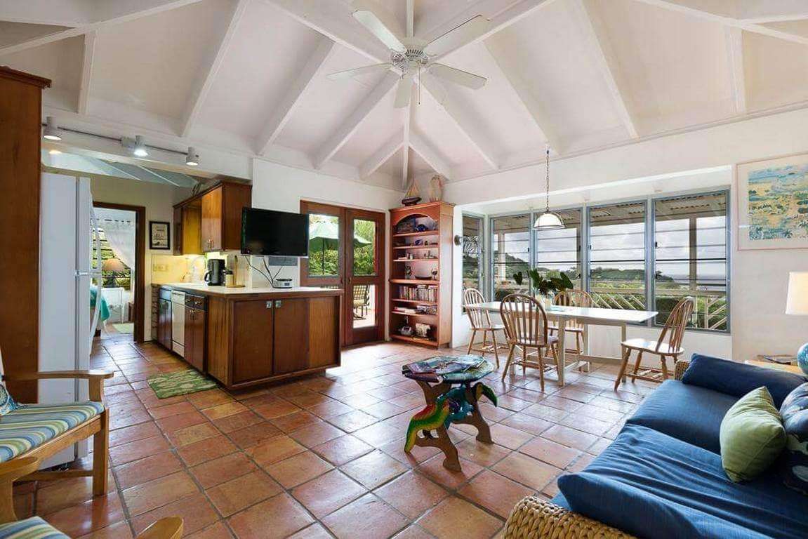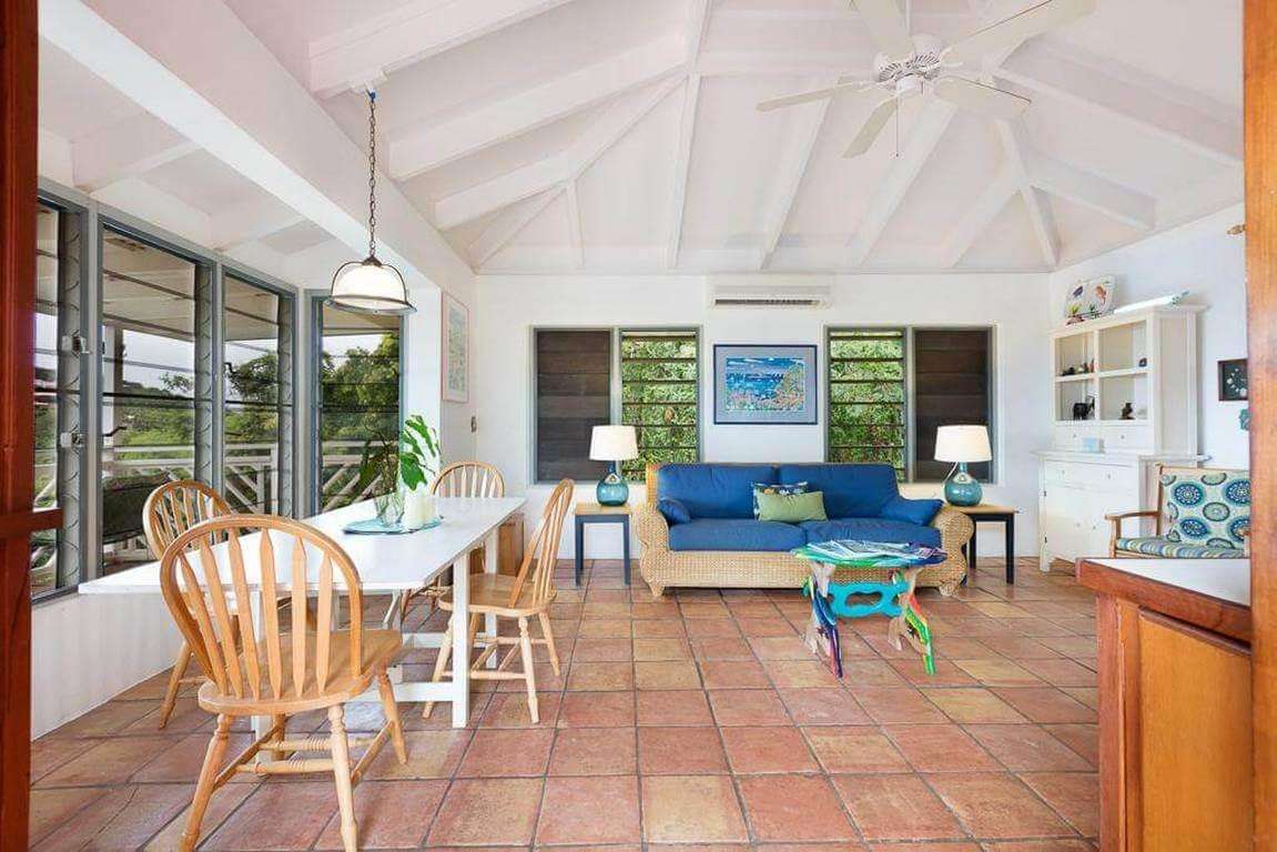 As with the location, the design of this graceful villa is also alluring. Completed in 1995, the one-story custom design is child friendly, spacious and comfortable. Only a few St. John villas combine this much space and privacy with such easy access to so many activities and amenities. Tennis Villa consists of a 3 bedroom/3 bath main house plus a 1 bedroom/1 bath detached pool house. The main house contains a truly gourmet kitchen plus the living and dining areas, while the pool house overlooks the all weather surface tennis court. The arched doorways of the living area of the great house flow into a large garden courtyard that encircles a 43- foot pool. The south-facing courtyard gets all day sun and affords privacy and sunset views.