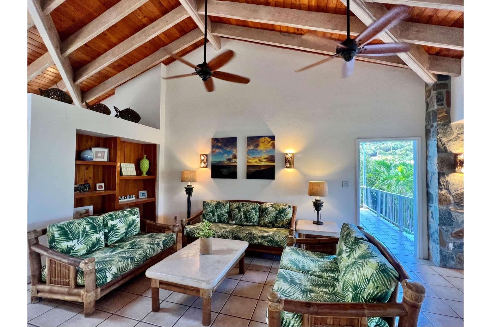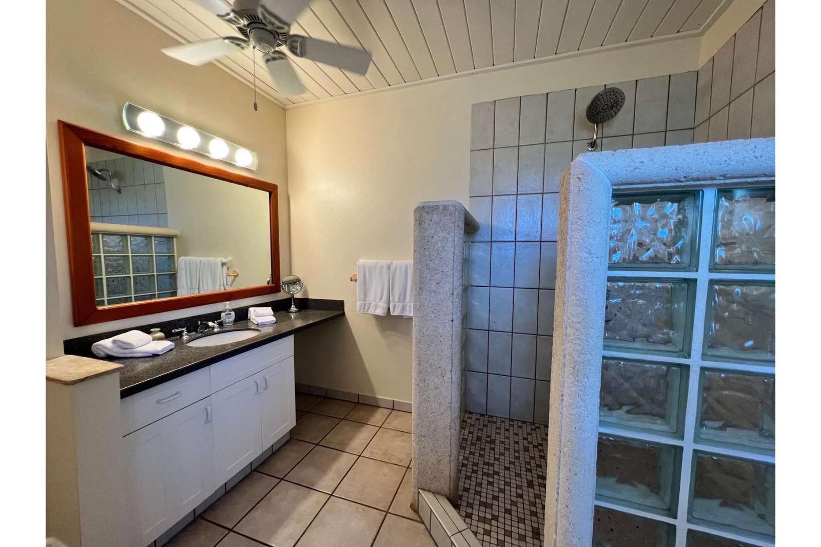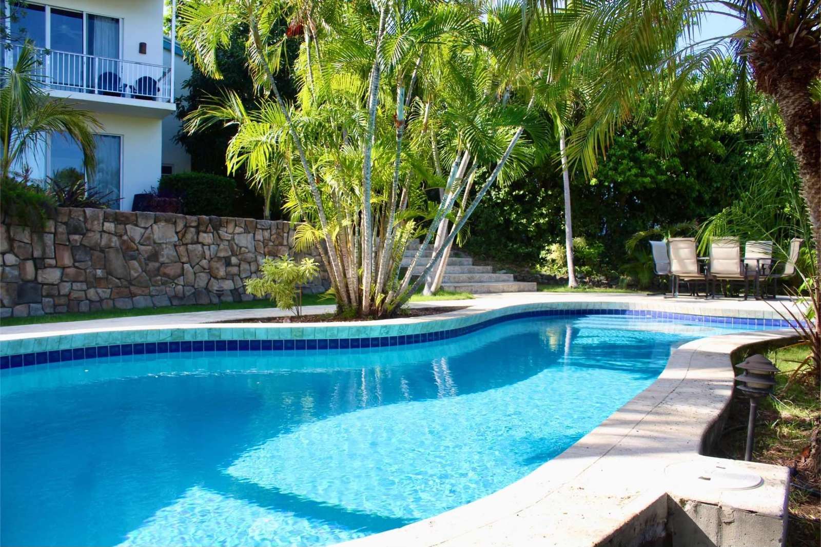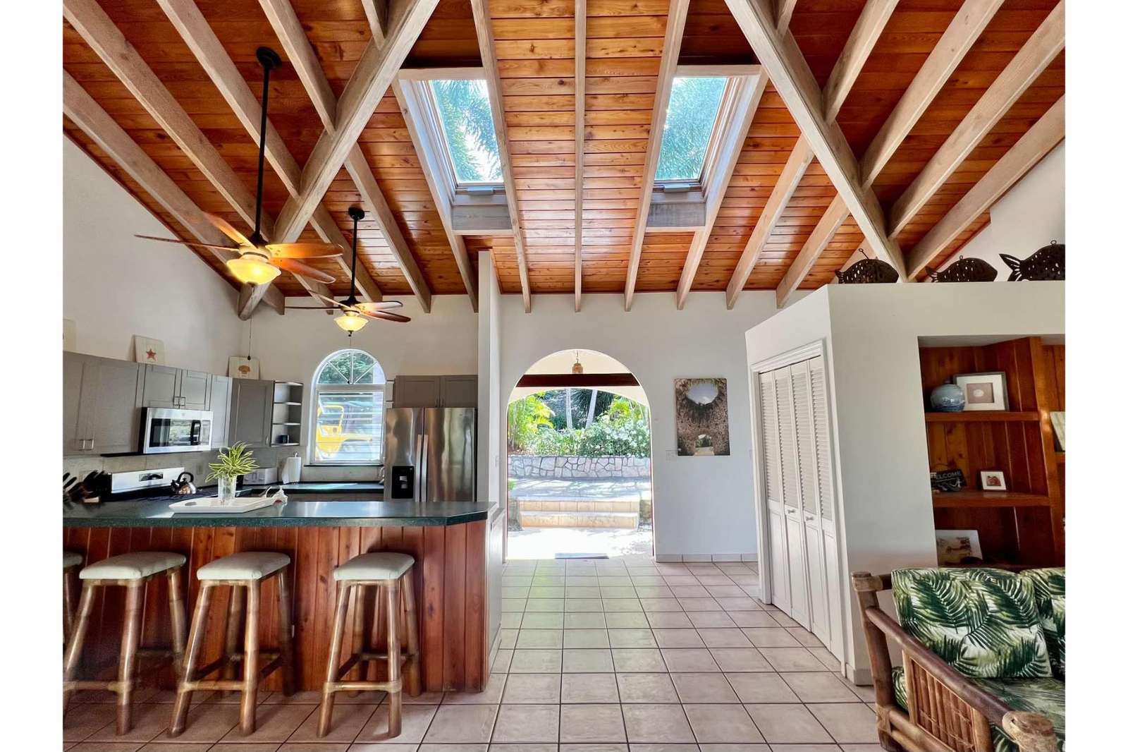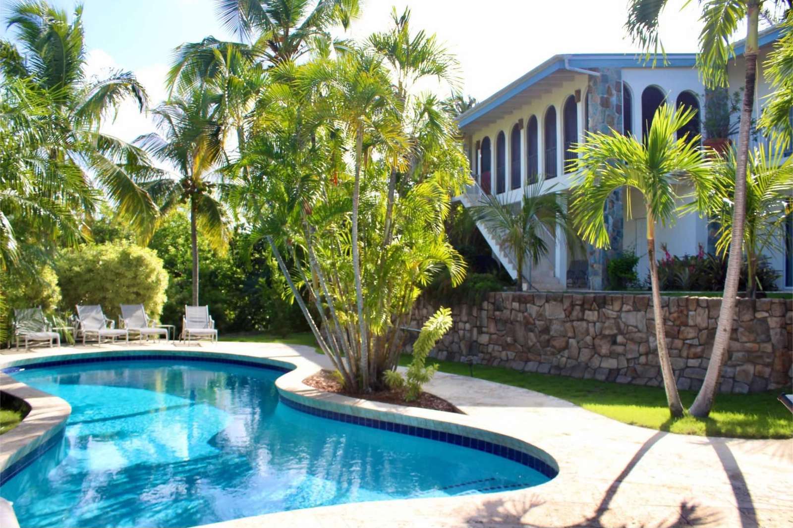 Outdoors, a lush, gently sloping lawn leads to the oversized, peanut-shaped pool. The grounds are especially well-suited for families, offering space for children to play while you unwind, grilling dinner, enjoying the cooling trade winds, and settling into the relaxed rhythm of island living after a day at the beach.