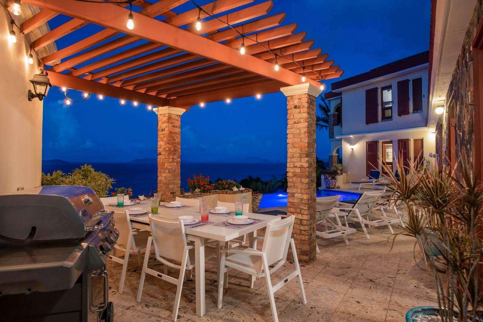 Outdoor Weber grill with covered pergola dining space on terrace.