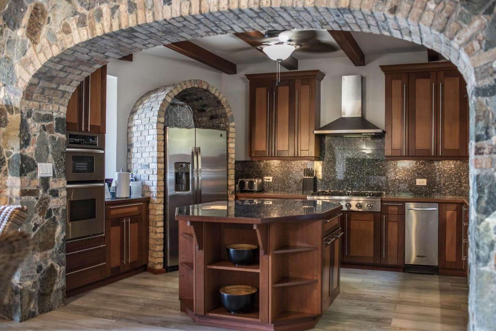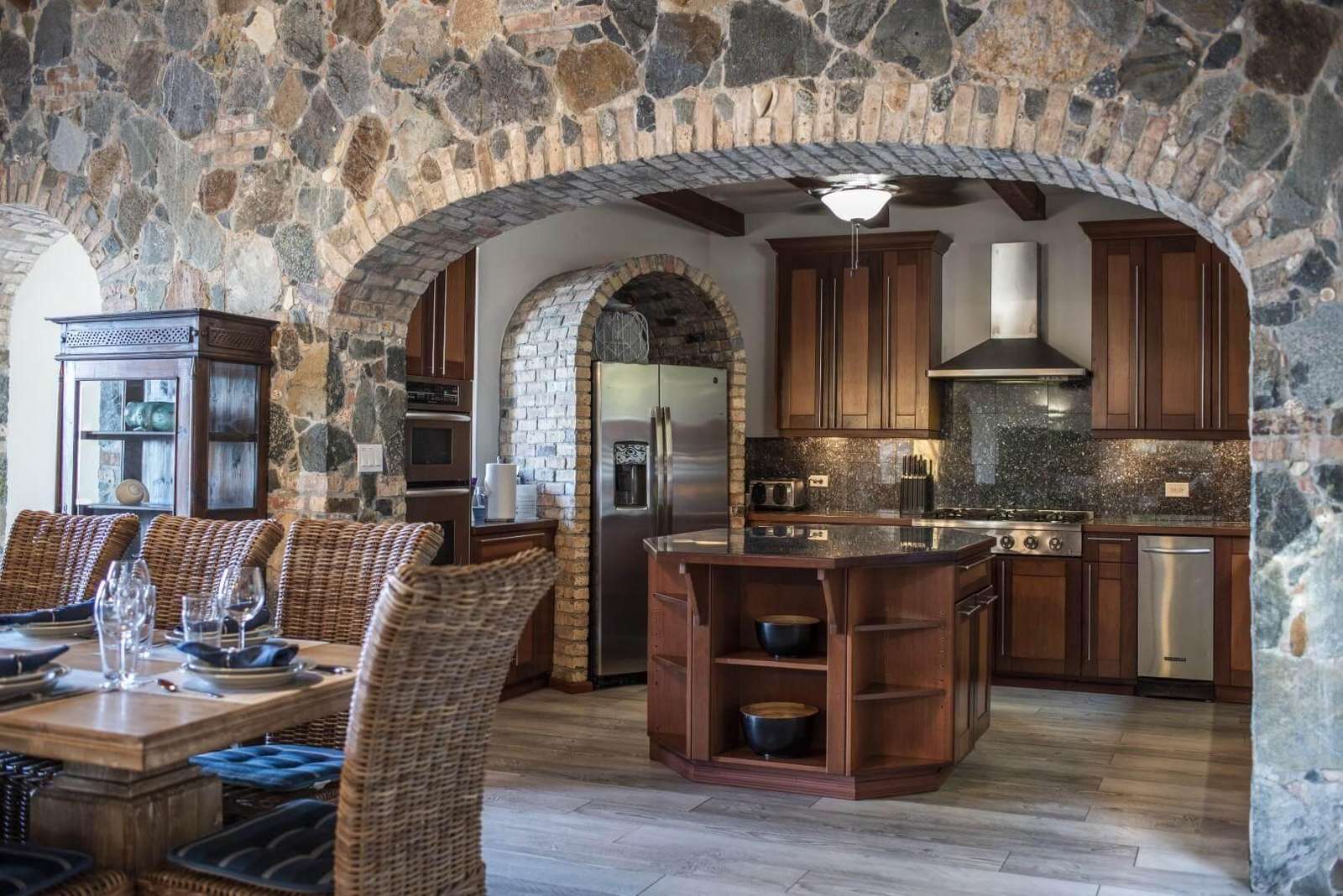 Chef Kitchen with wine storage and six burner cooktop.
