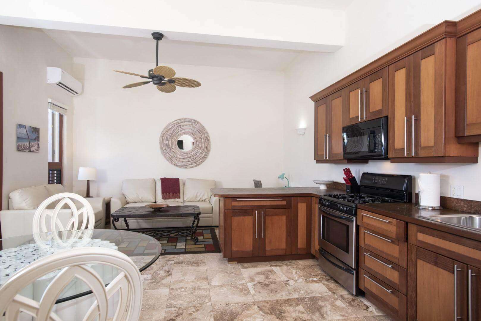 One Queen Bedroom Apartment with living area, full kitchen and private terrace. Full size bed pullout in apartment couch.