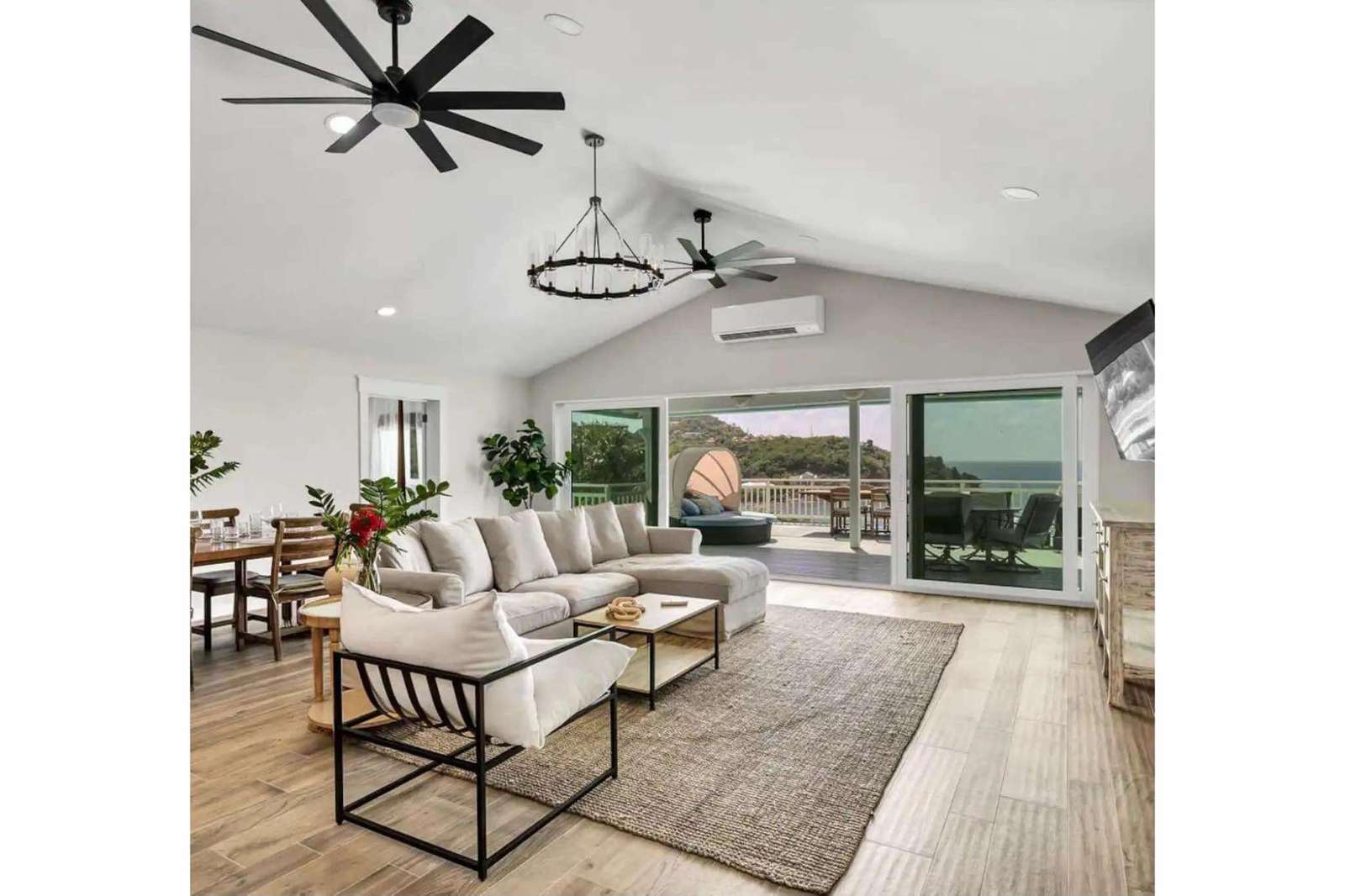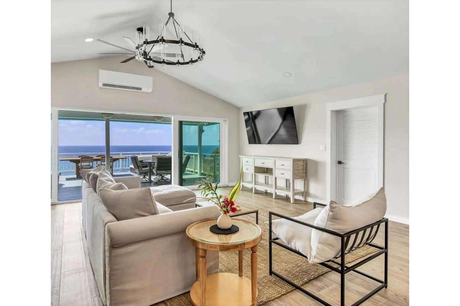 The villa boasts three spacious bedrooms on the upper level, each with its own private bathroom and a comfortable king-sized bed. The main level features a fully equipped kitchen, a dining area, and a cozy living space, all adorned with stylish furnishings. Step out onto the large balcony and soak in the breathtaking views of the ocean, creating the perfect backdrop for relaxation and memorable gatherings.