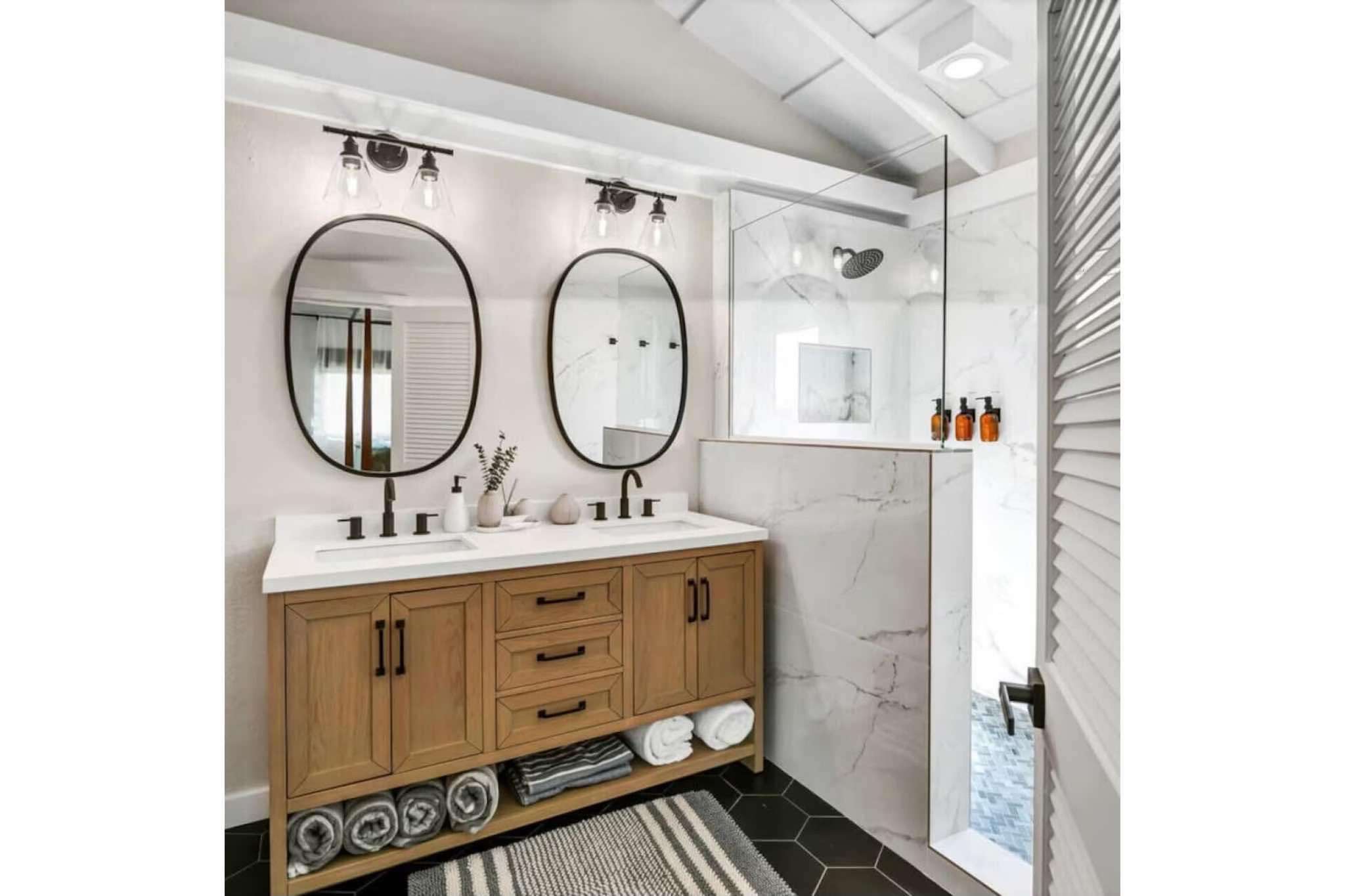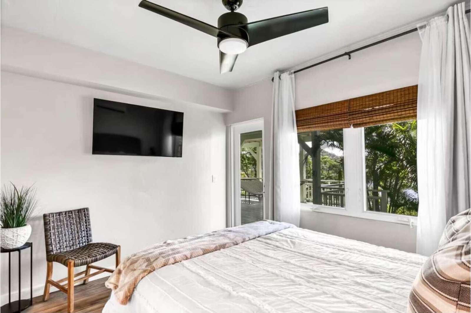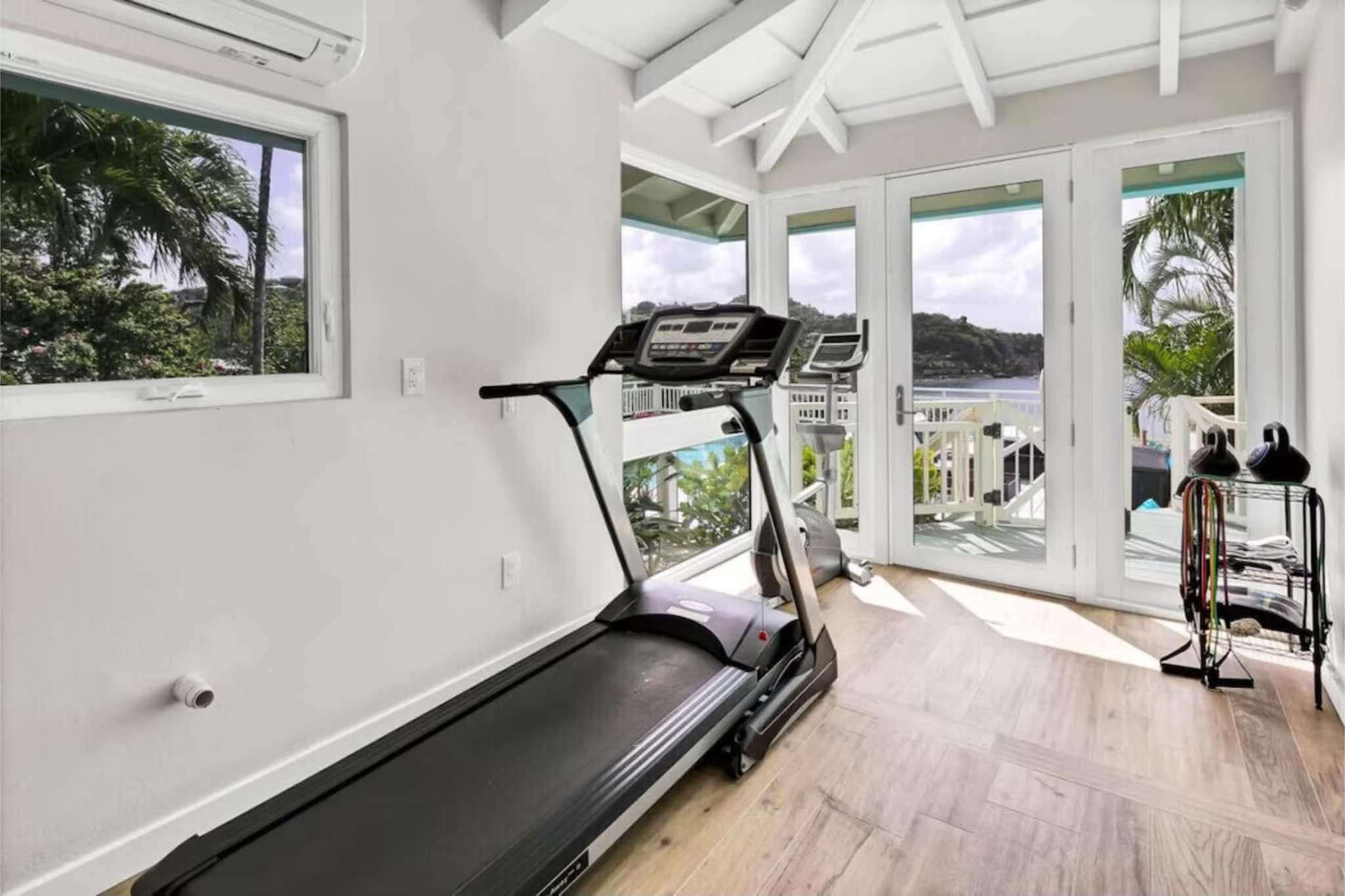On the ground level, you'll find two additional rooms. One room features a full-size bed and a full bathroom, while the other serves as a bunk room, offering a king-sized bed and two twin bunks. This level also provides a full shower and a comfortable couch. The gym, connected to the bunk room, is easily accessible from the pool deck, allowing you to maintain your fitness routine while enjoying the tropical surroundings.